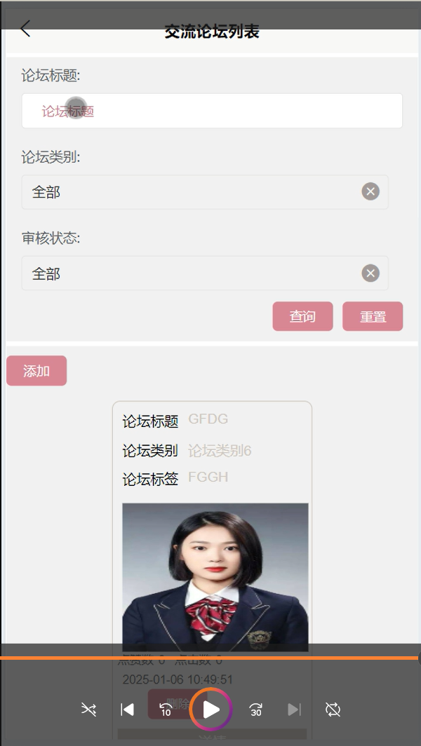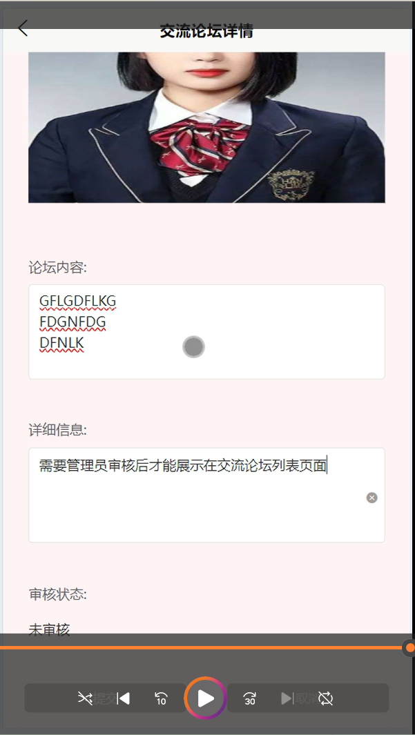 管理员负责审核用户发布的论坛帖子。管理员可以查看帖子详情,审核帖子的内容以及用户的评论。管理员还可以根据需要进行删除、修改或重置操作。界面如下图所示。