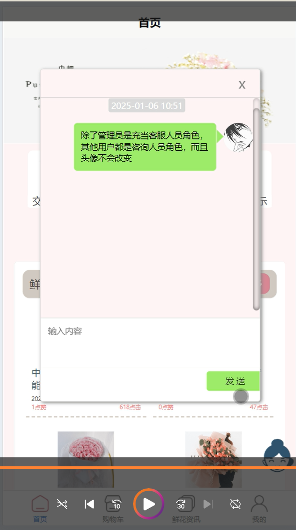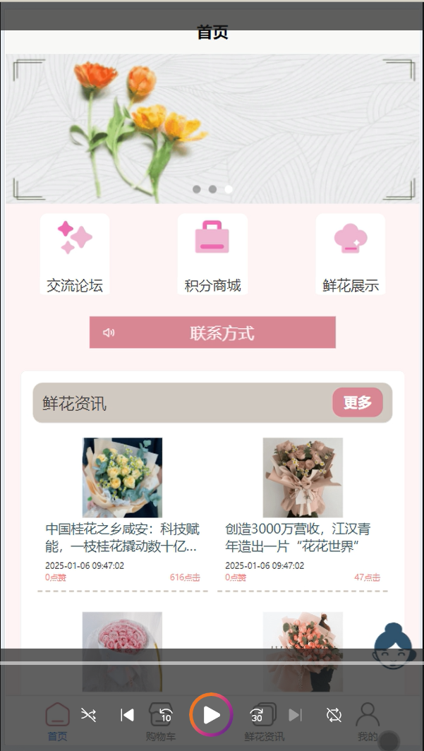 首页:用户进入系统后,可以查看首页的轮播图、网站公告、交流论坛、积分商城、鲜花展示、鲜花资讯等内容。首页提供导航栏,用户可通过点击快速访问不同的模块,或向管理员客服咨询相关问题。