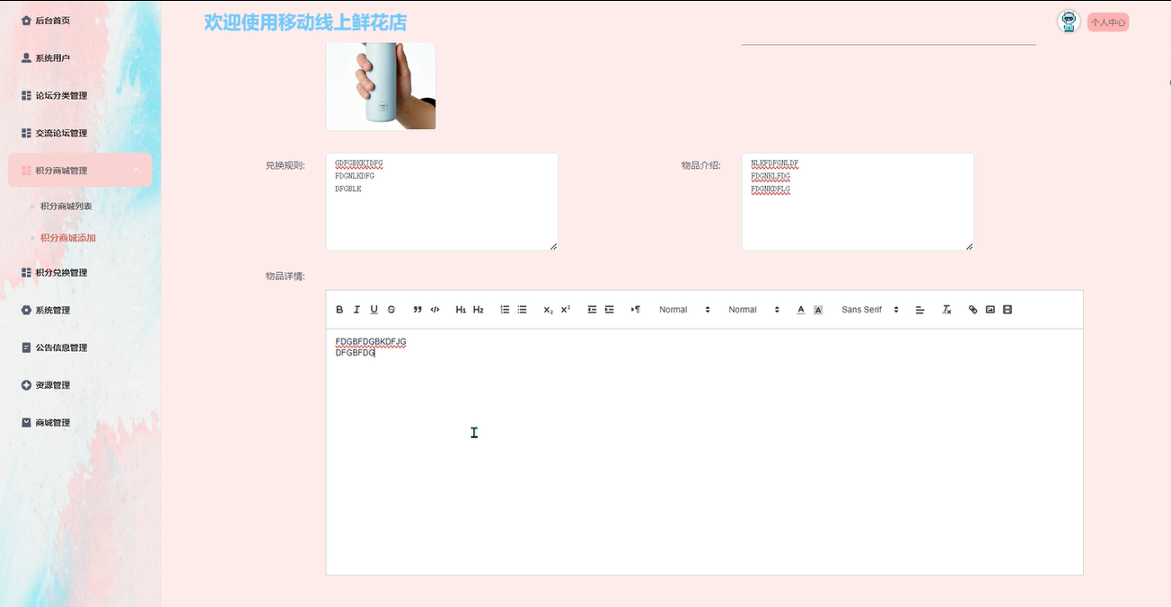 | 6-4 | 积分商城添加 | 1. 进入后台积分商城管理界面,点击添加按钮。 | 显示积分商城添加页面。 |