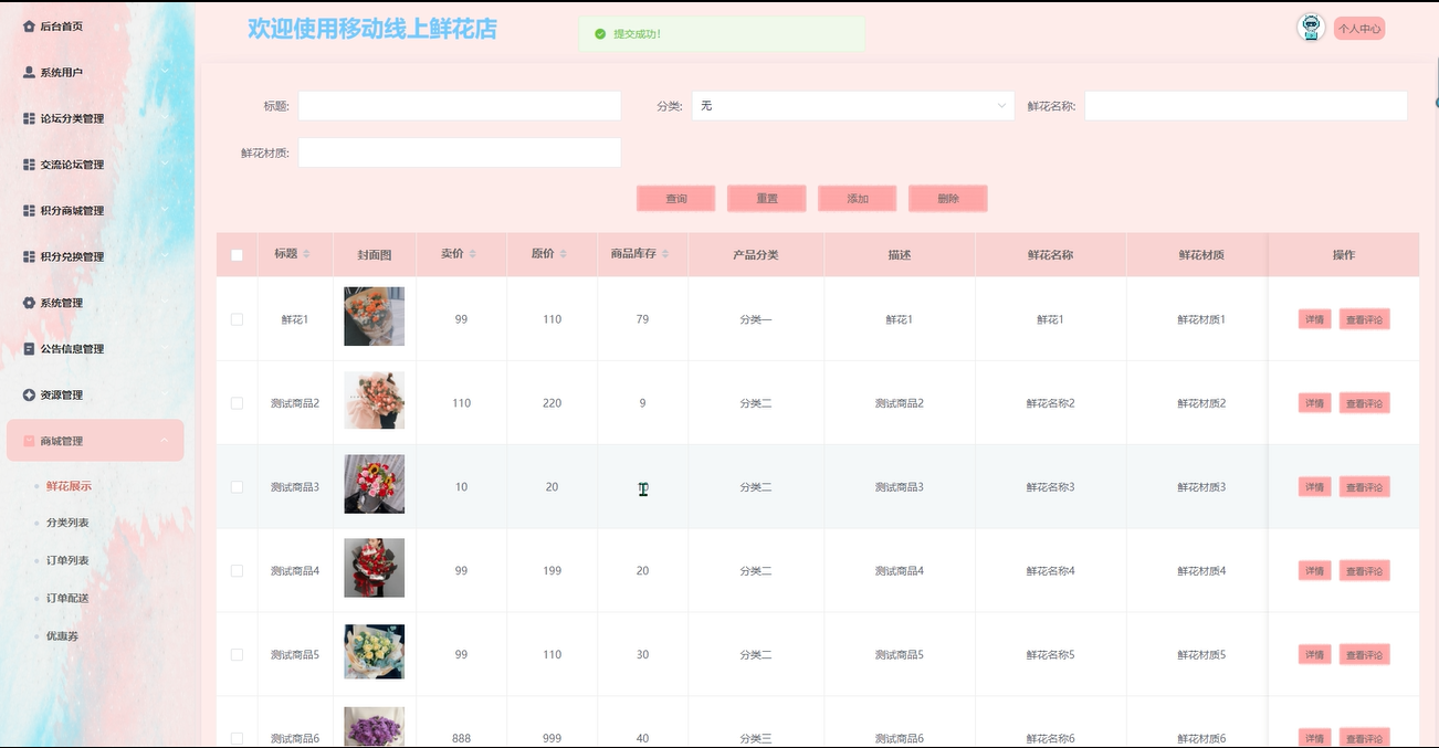 管理员可以查看商城中鲜花的详细信息,包括名称、材质、价格、用户评论等。管理员可以对鲜花展示、分类、订单等进行管理,确保商城产品的精确展示和及时更新。界面如下图所示。