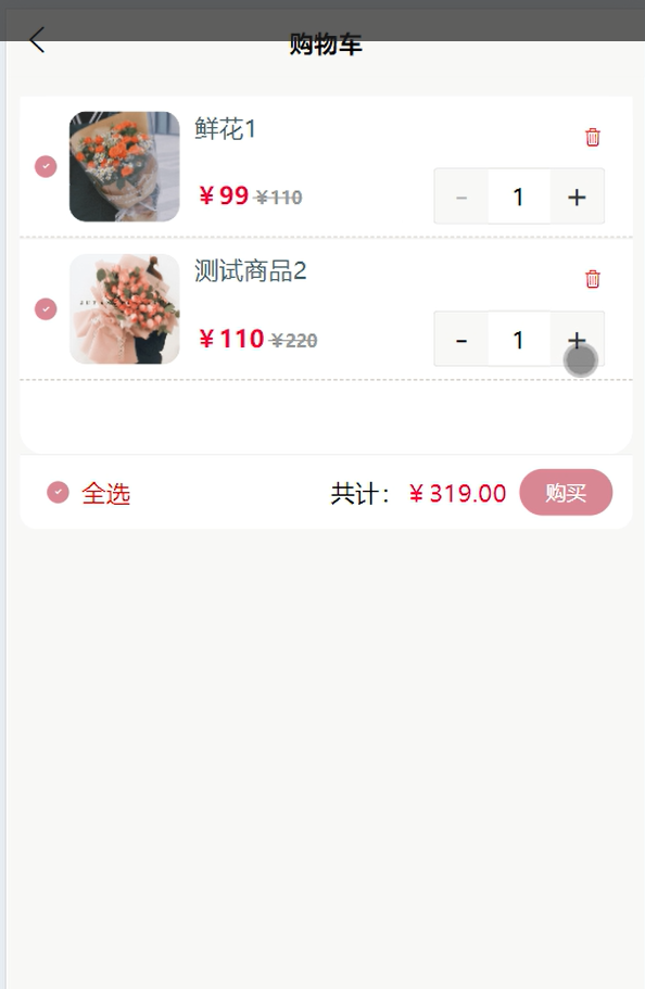 | 6-4 | 加入购物车 | 1. 进入前台鲜花展示详情页,点击加入购物车按钮。 | 显示加入购物车页面。 |