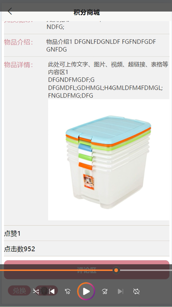 积分商城:在积分商城模块,用户可以查看可以用积分兑换的商品,商品展示包括名称、品牌、规格、所需积分等信息。用户可以通过搜索框输入商品名称、规格等进行筛选,并可以对商品点赞、收藏、评论或进行兑换。
