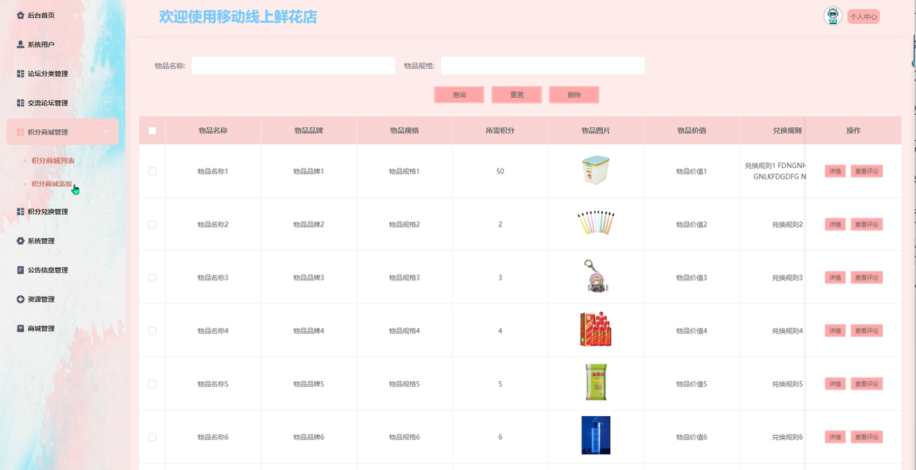 管理员可以查看积分商城内所有商品的详情,包括商品名称、品牌、规格、所需积分等信息。管理员可以对商品进行添加、删除、修改、查询等管理操作,确保商城商品的准确性和丰富性。界面如下图所示。