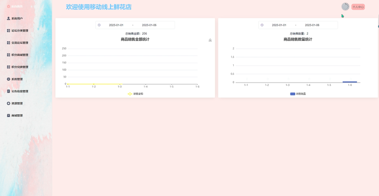 后台首页:管理员可以查看商品销售金额统计、商品销售数量统计等折线图,修改个人资料和登录密码等。