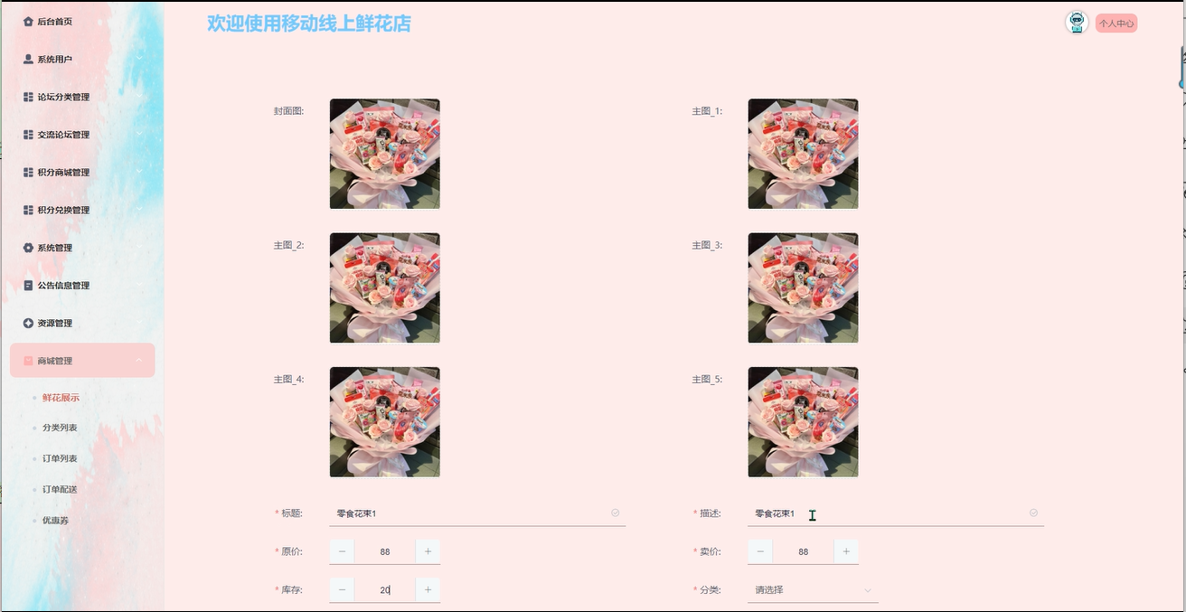 | 6-4 | 鲜花展示添加 | 1. 进入后台商城管理-鲜花展示管理界面,点击添加按钮。 | 显示鲜花展示添加页面。 |