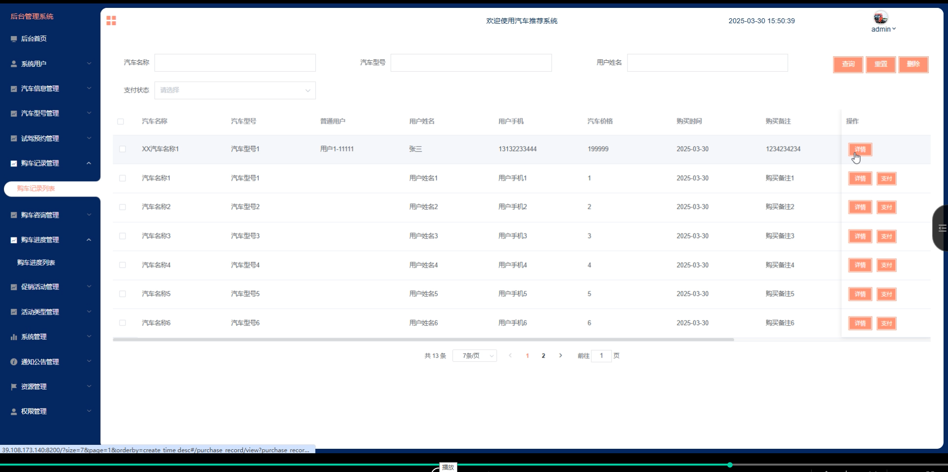 管理员点击“购车记录管理”这一菜单会显示购车记录列表这个子菜单,点击“购车记录列表”可以查看购车记录详情和支付情况,可以进行查询、重置和删除等操作。购车记录管理界面如下图所示。