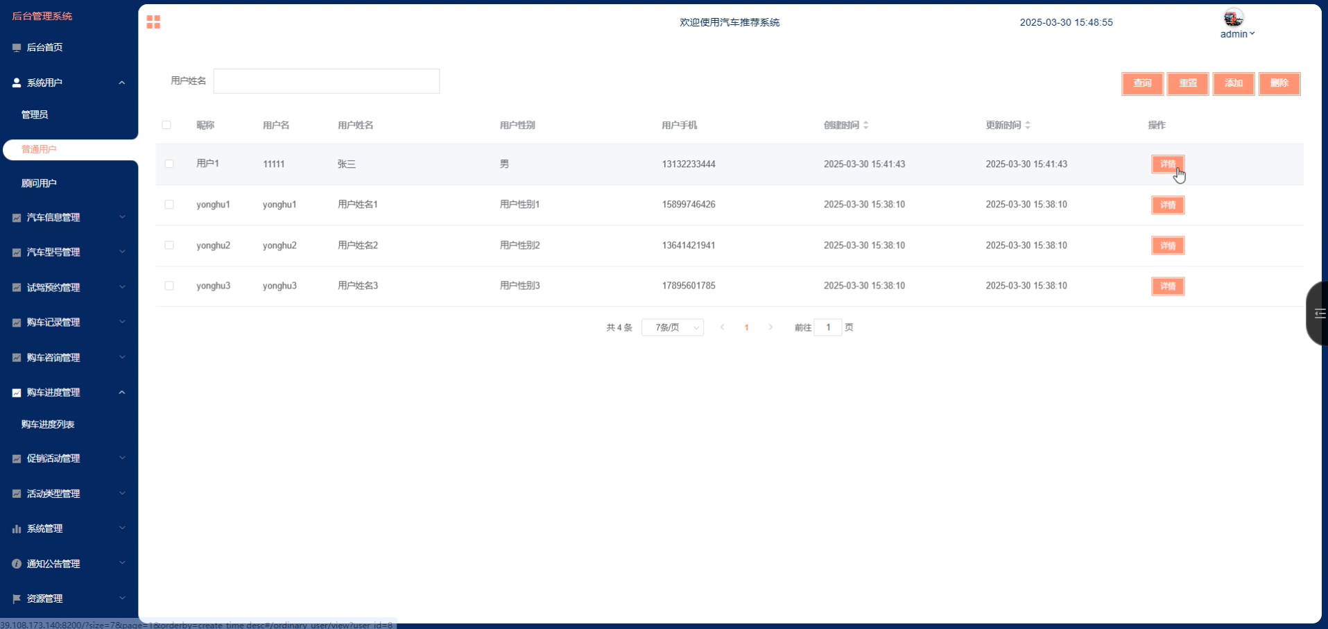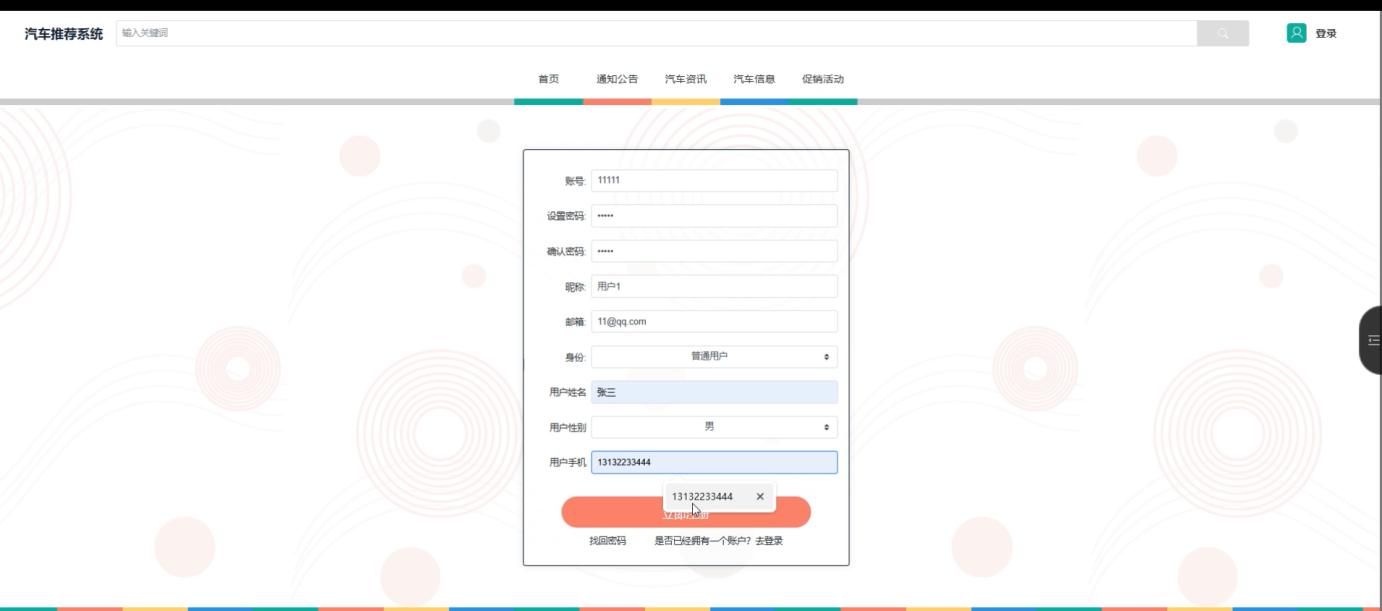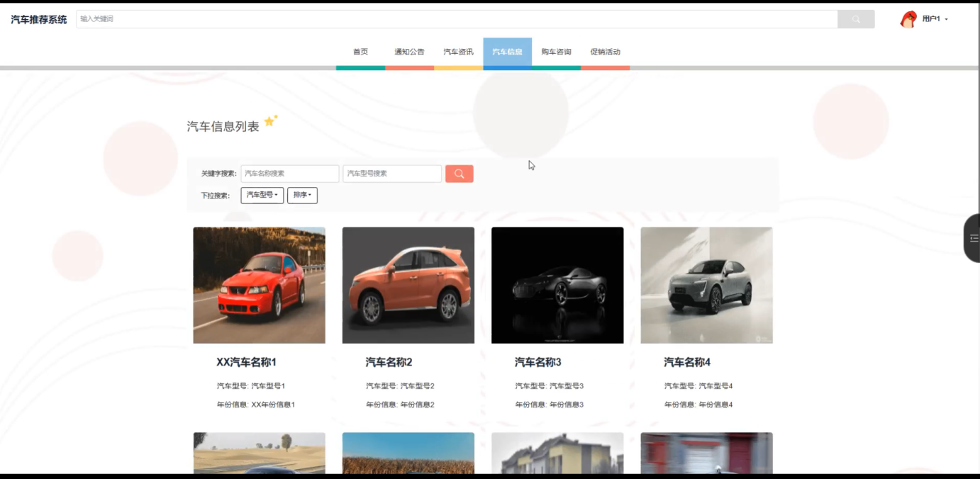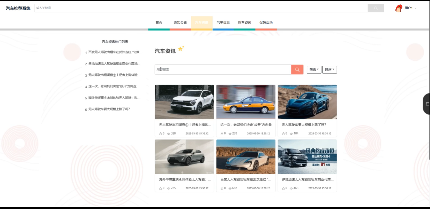 The system is divided into three main roles: administrator, regular user, and consultant user. Administrators can comprehensively manage car information, test drive reservations, purchase records, promotional activities, etc., to ensure system data updates and maintenance; Ordinary users can browse car information, obtain car purchase inquiries, view promotional activities, and make decisions based on recommendation results through the system; Consultant users can further view the user's car purchase progress and history, and provide personalized car purchase advice to the user. In addition, the system also integrates an automotive information module, making it convenient for users to obtain the latest automotive updates.