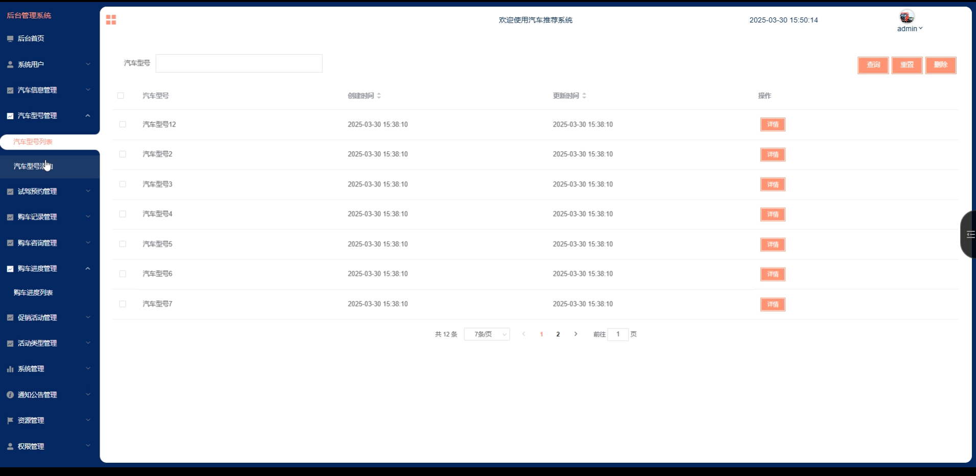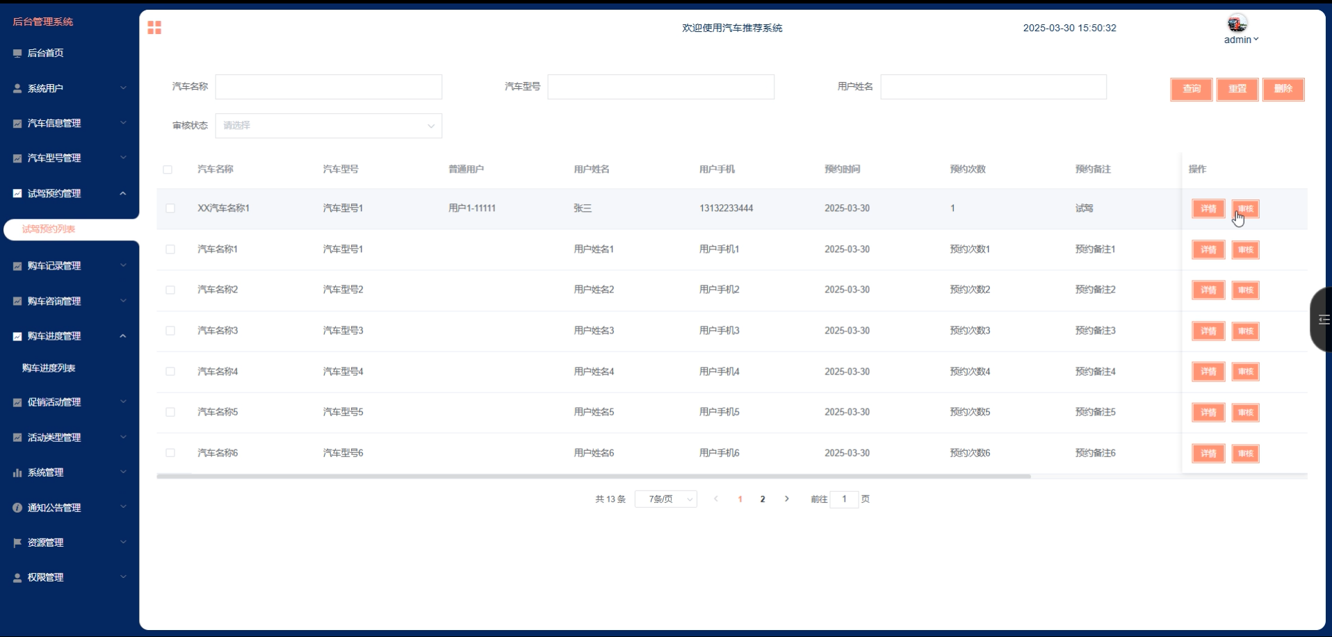 管理员点击“试驾预约管理”这一菜单会显示试驾预约列表这个子菜单,点击“试驾预约列表”可以查看试驾预约详情,可以进行查询、重置、删除、审核等操作。试驾预约管理界面如下图所示。