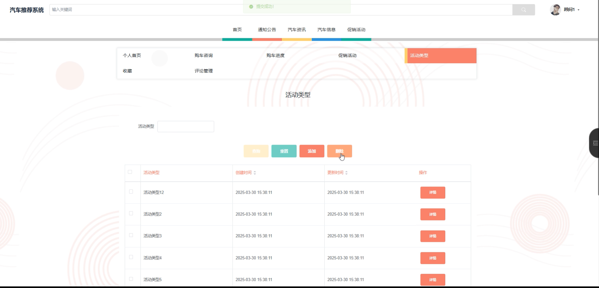 顾问用户可以查询、重置、添加和删除不同类型的促销活动,例如折扣、赠品、限时优惠等,并将这些活动信息推荐给客户,以帮助客户做出购买决策。活动类型界面如下图所示。