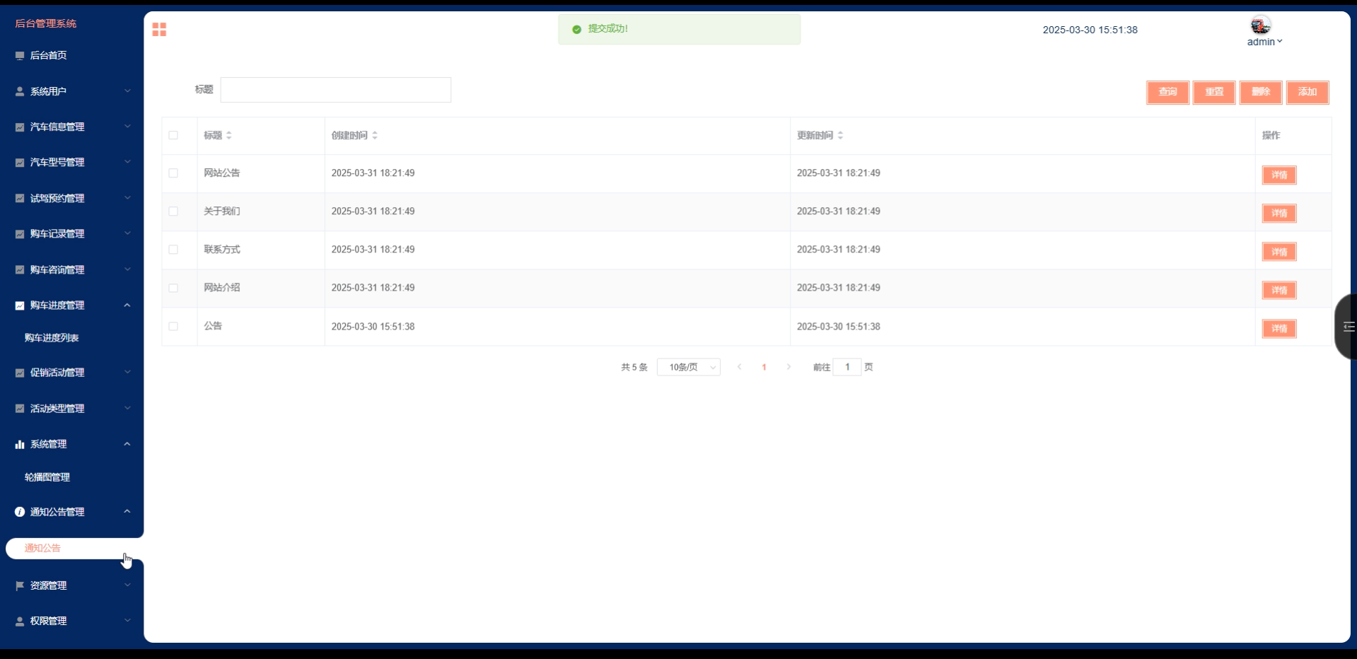资源管理(汽车资讯、资讯分类):发布和管理汽车相关的资讯内容,按分类进行管理。