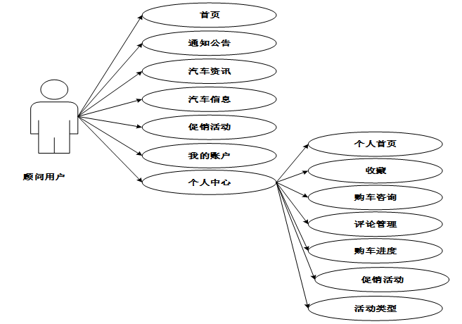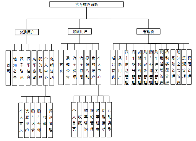 系统分为三个主要角色:管理员、普通用户和顾问用户。管理员可对汽车信息、试驾预约、购车记录、促销活动等进行全面管理,确保系统的数据更新与维护;普通用户可以通过系统浏览汽车信息、获取购车咨询、查看促销活动,并根据推荐结果进行决策;顾问用户则可以进一步查看用户的购车进度和历史记录,为用户提供个性化的购车建议。此外,系统还集成了汽车资讯模块,方便用户获取最新的汽车动态。