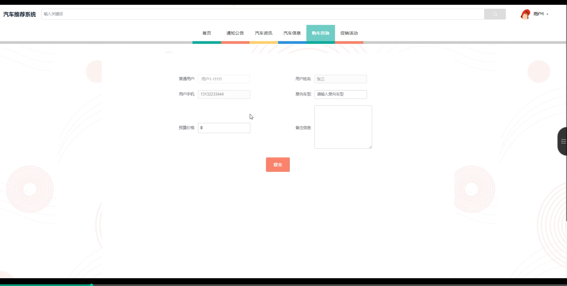 购车咨询模块允许普通用户提交与购车相关的问题或需求,系统会根据用户的查询内容提供相应的解答。用户可以获得个性化的购车建议,帮助他们做出更为明智的购买决策。购车咨询界面如下图所示。