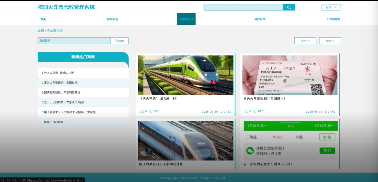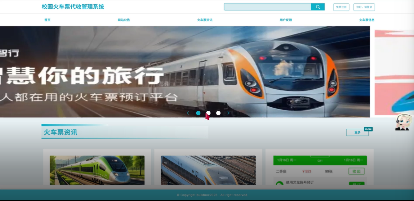 首页:用户登录后会进入系统首页,首页展示火车票资讯、网站公告和系统推荐内容等。首页界面简洁直观,便于用户快速找到自己需要的信息。