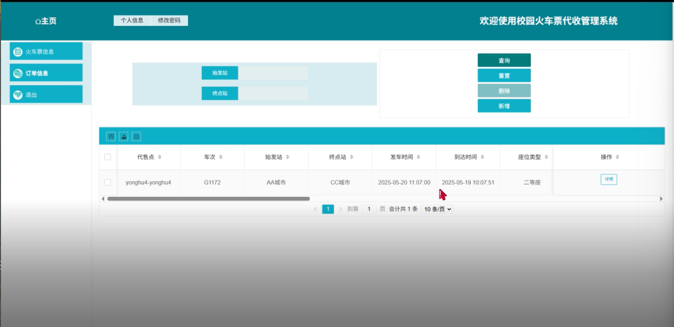 主页:代售点的主页显示了代售点的基本信息和系统中火车票的销售信息,包括火车票的预订情况、销售进度等,方便代售点管理和查看。