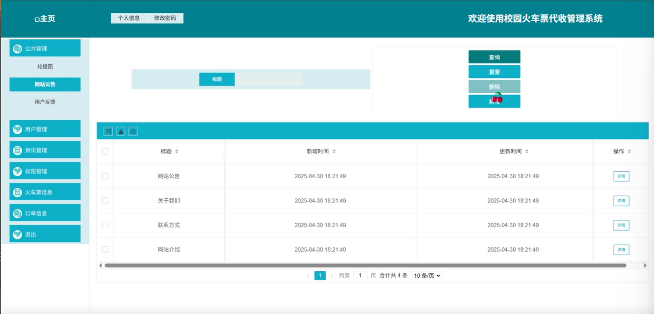 网站公告:用户可以查看网站发布的公告信息。公告主要涉及系统更新、节假日火车票政策变动等内容。通过公告模块,用户可以及时了解系统的最新动态。