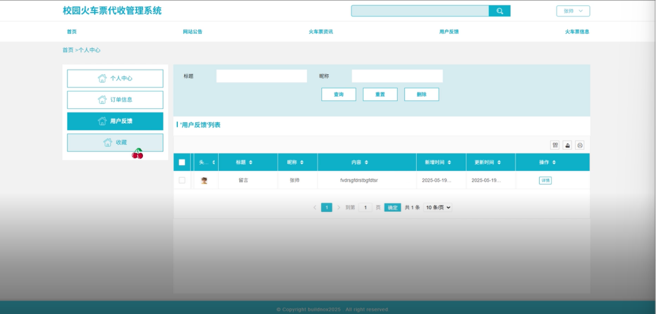 通过测试验证,校园火车票代收管理系统能够有效提高火车票代收过程的管理效率,降低人工操作的复杂度,并提升用户的使用体验。校园火车票代收管理系统不仅适用于高校的火车票代收服务,还可以为其他类似场景的服务提供借鉴。最终,本文为校园火车票代收管理提供了一种可行且高效的解决方案,推动了校园信息化建设的发展。