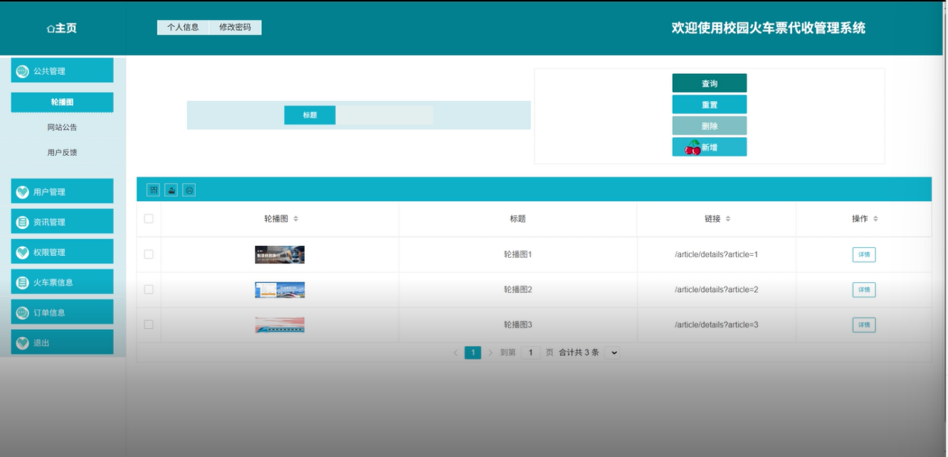 主页:管理员登录后进入系统主页,主页展示了火车票销售的整体情况、系统公告以及系统的各类数据统计。管理员可以快速了解系统运行状况。