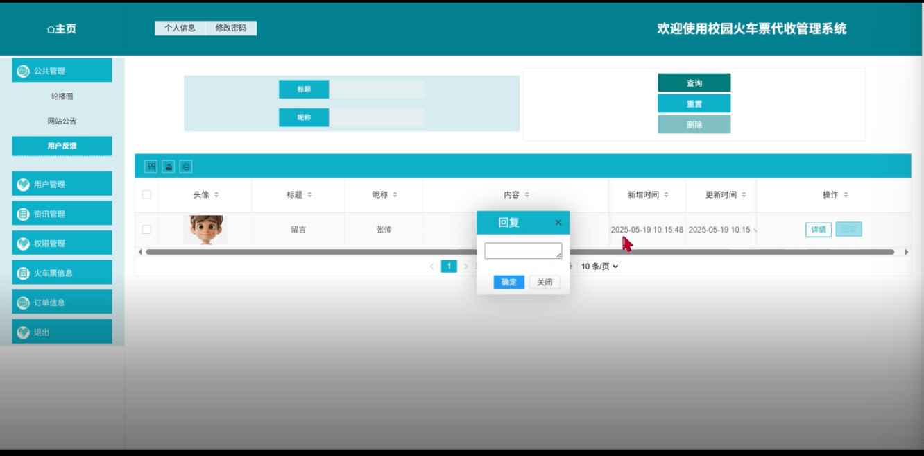 用户反馈:注册用户可以通过反馈模块向管理员或系统提出问题或建议。反馈可以是关于火车票购买流程的问题、系统操作上的疑虑或用户体验方面的改进意见,帮助管理员更好地提升系统功能和服务质量。