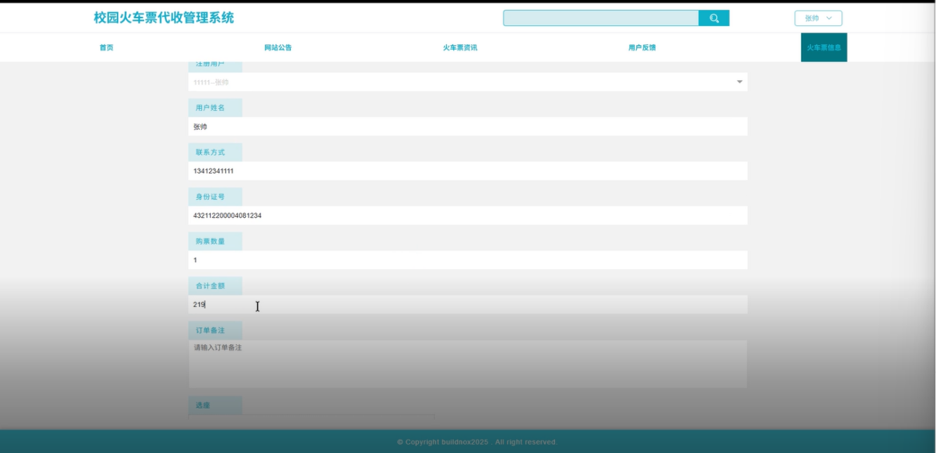 火车票信息:在火车票信息模块,用户可以浏览到当前可用的火车票,并能够根据出发地、目的地、日期等信息进行查询。用户还可以查看具体的火车票信息,包括票价、车次、剩余票数等。用户选择合适的火车票后,系统会引导用户填写相关信息并提交预订请求。