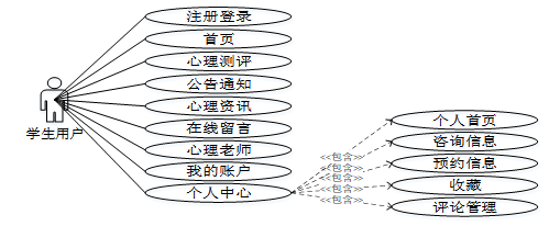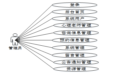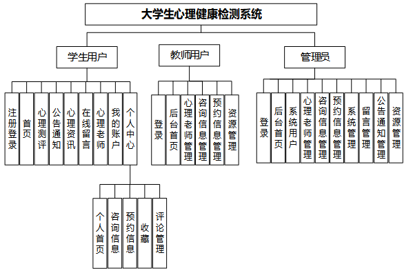 系统主要分为学生用户、管理员和教师用户三大模块。学生用户可以通过参与心理测评了解自身心理健康状态。此外,还提供了公告通知、心理资讯、在线留言等功能帮助学生及时获得相关信息和支持。对于教师用户,可以通过后台管理系统对学生咨询和预约信息进行管理,同时负责心理老师的管理工作。管理员则具有最高权限,能够管理系统的全部内容,包括系统用户的管理、心理老师管理、资源管理和公告通知管理等,确保整个系统的正常运行和服务质量。