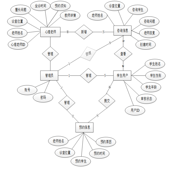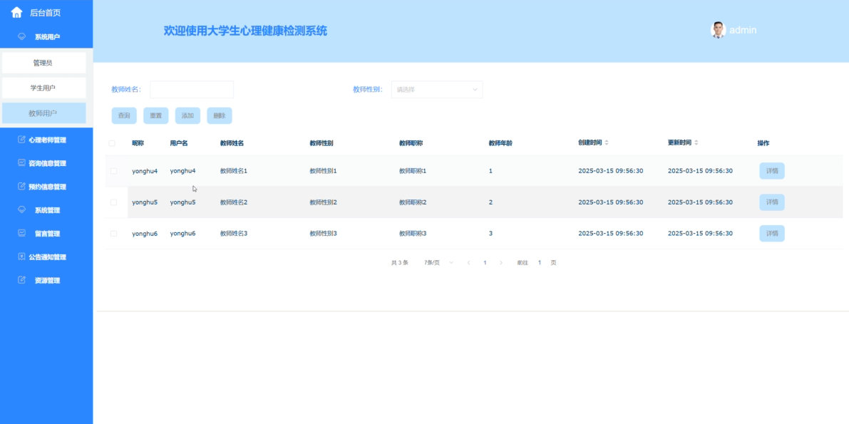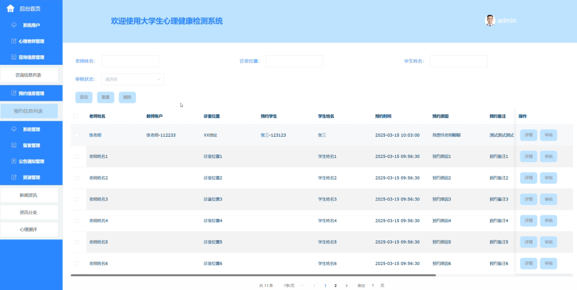 The system is mainly divided into three modules: student users, administrators, and teacher users. Student users can understand their own mental health status by participating in psychological assessments. In addition, it also provides functions such as announcement notifications, psychological information, and online messages to help students obtain relevant information and support in a timely manner. For teacher users, they can manage student consultation and appointment information through the backend management system, while also being responsible for the management of psychological teachers. Administrators have the highest authority to manage all the contents of the system, including user management, psychological teacher management, resource management, and announcement notification management, ensuring the normal operation and service quality of the entire system.