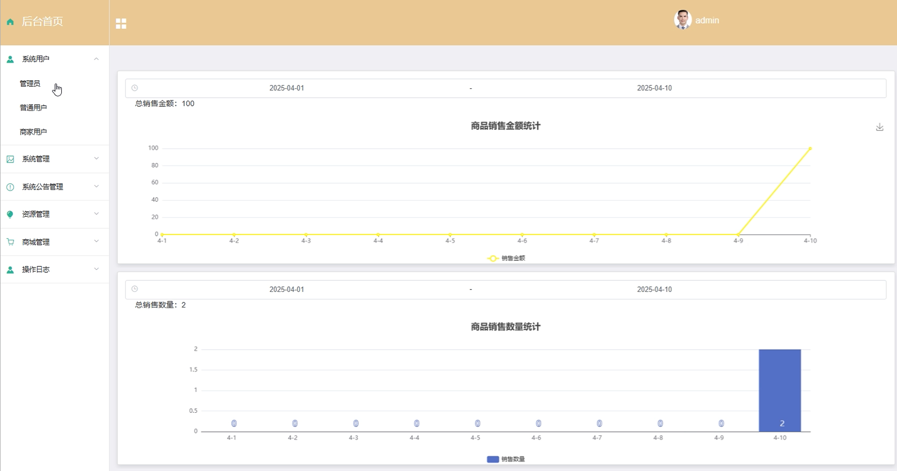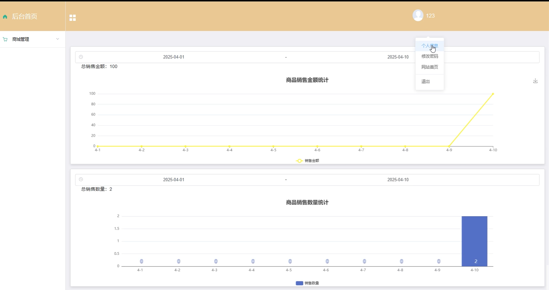 - 后台首页:商家用户点击可查看商品销售金额和销售数量数据统计图。