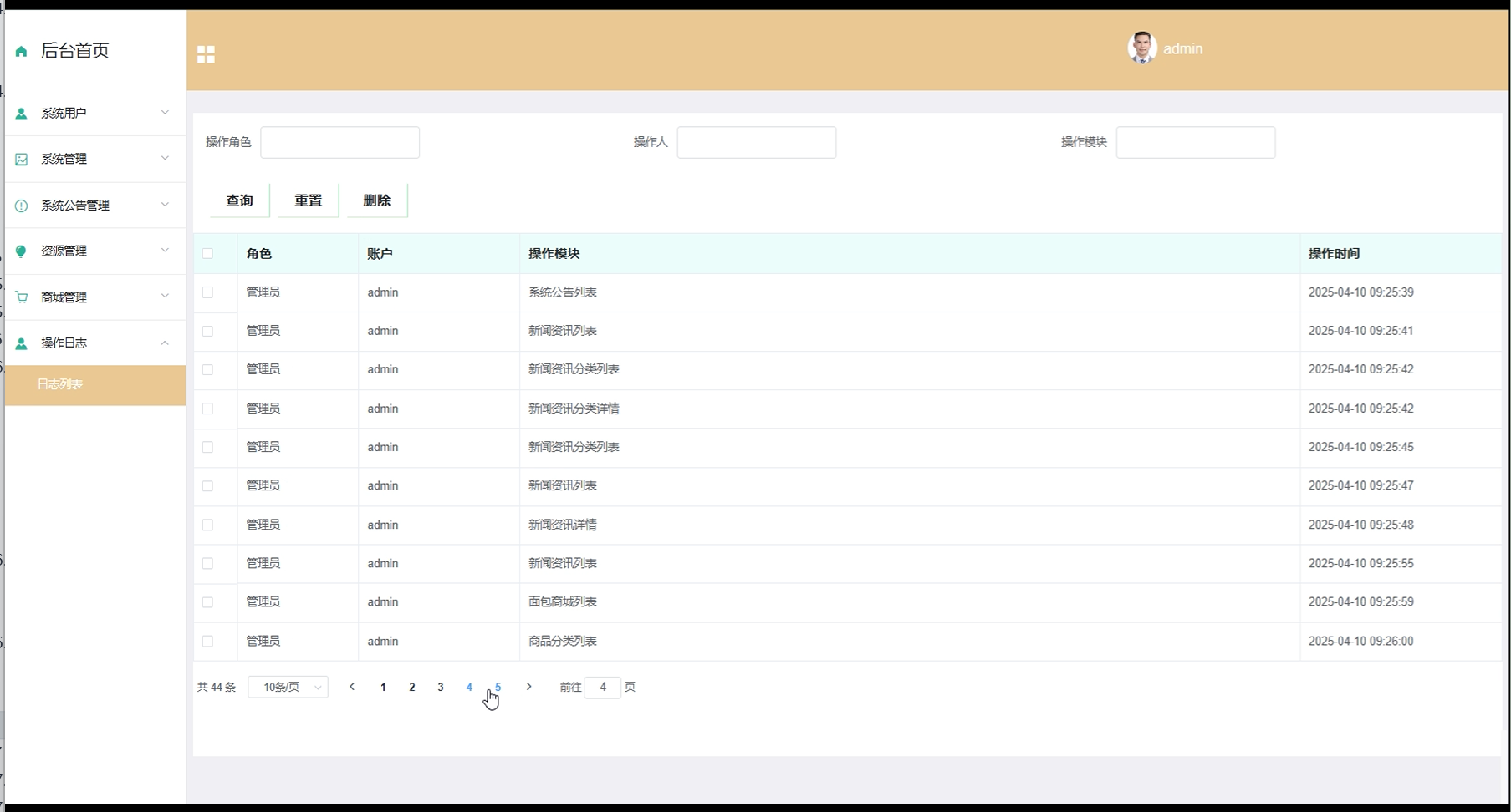 操作日志界面包括日志列表功能,管理员可以通过查询功能搜索特定的日志记录,重置则清除搜索条件,删除功能用于删除不需要的日志记录。这些功能帮助管理员跟踪和管理系统中的操作历史。界面如下图所示。