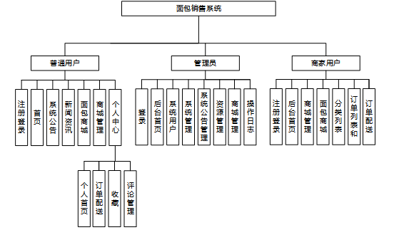 面包销售系统包含普通用户、商家用户、管理员三个角色划分,每个角色对应的主要功能如下: