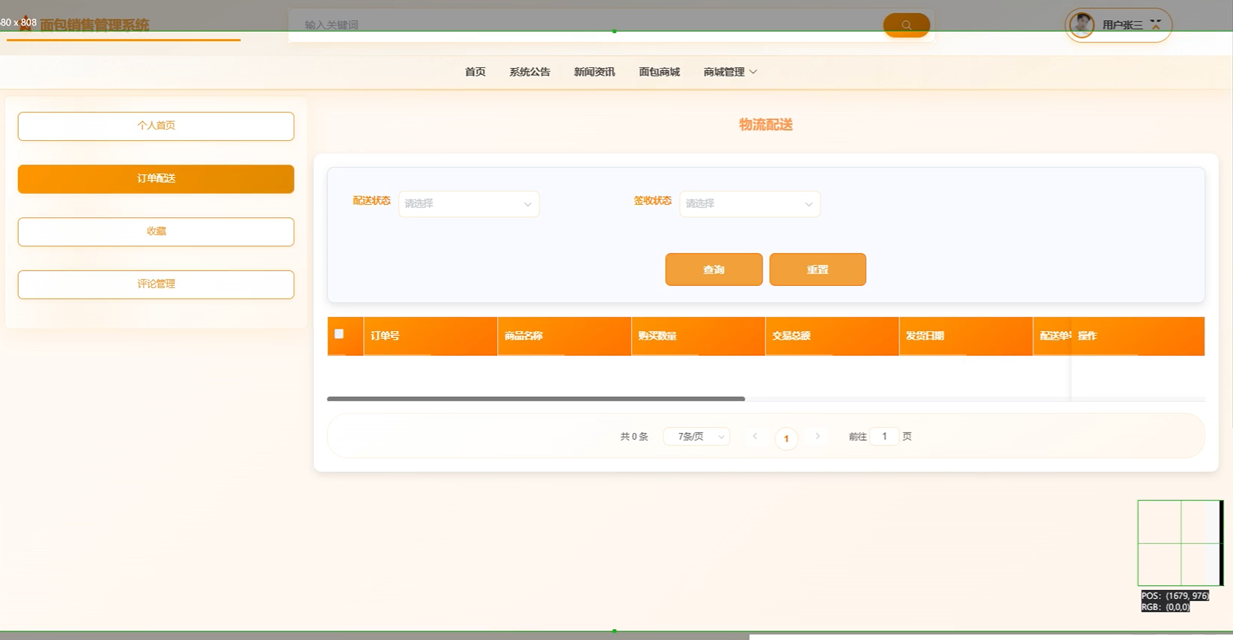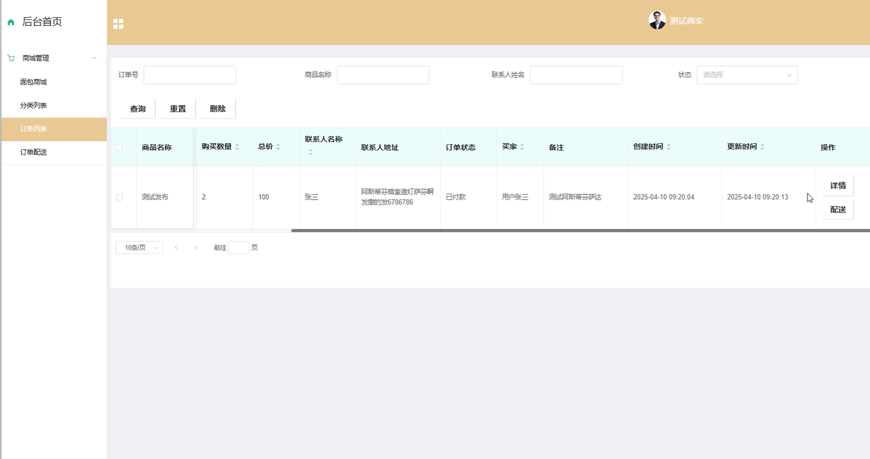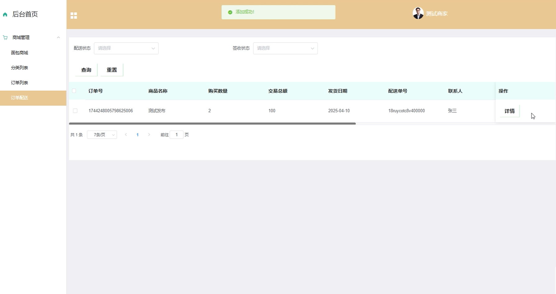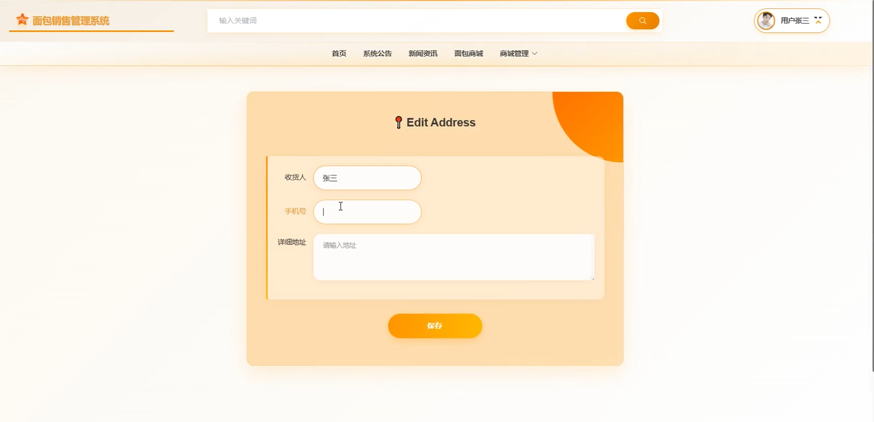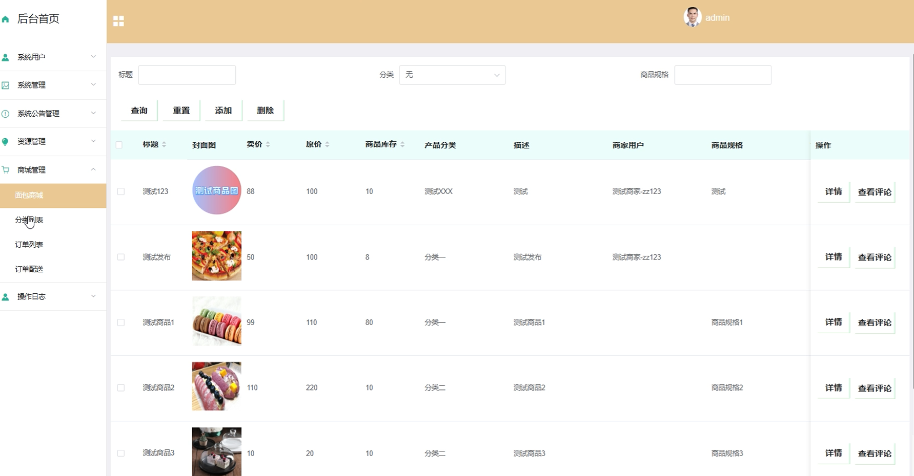 管理员通过商城管理功能能够高效地进行商品和订单的综合管理。这包括在面包商城中添加或编辑商品、利用分类列表对商品进行归类整理、查看并处理订单列表中的顾客订单,以及通过订单配送模块跟踪物流状态等服务。界面如下图所示。