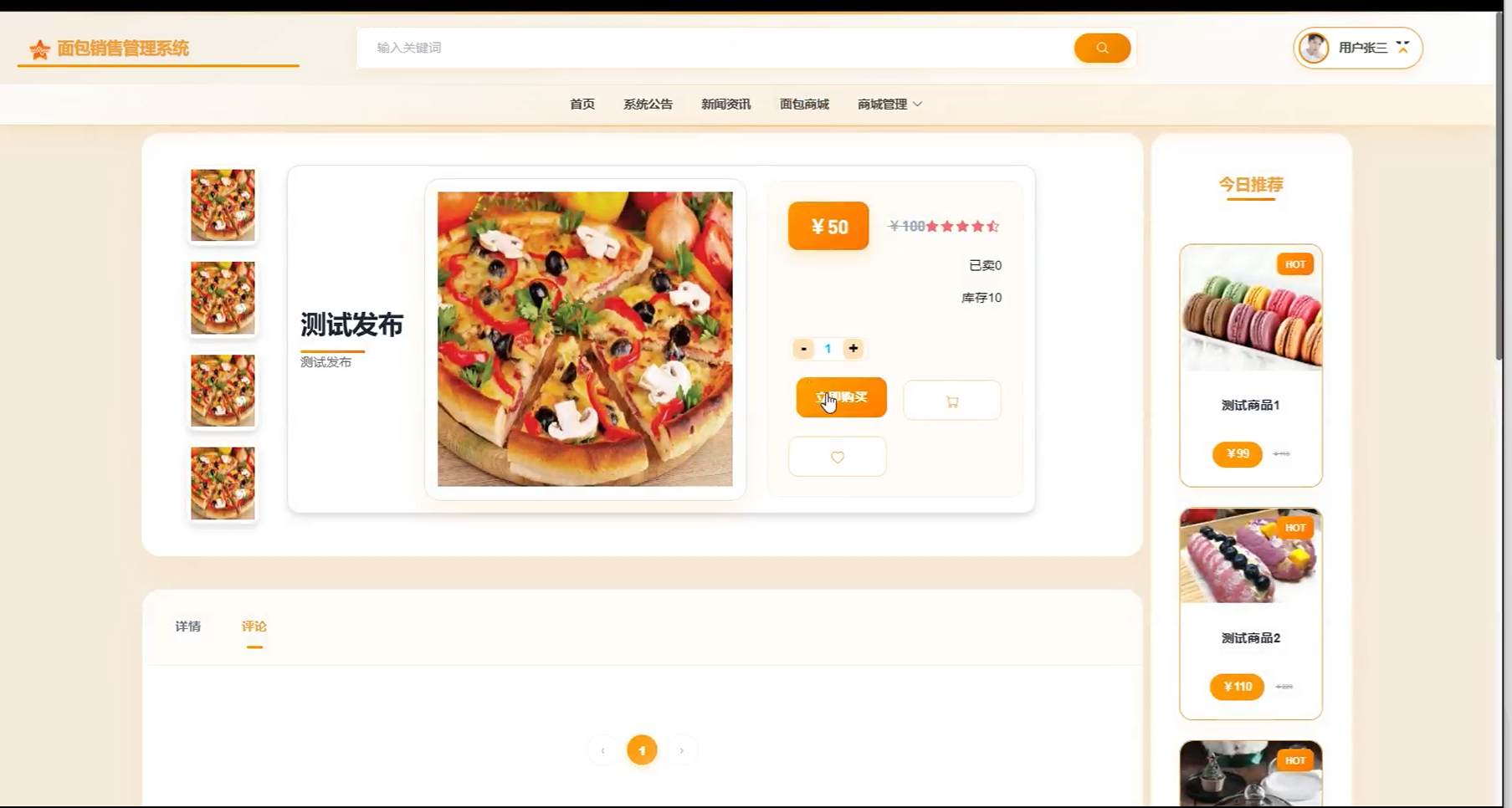 (5)面包商城:面包商城界面展示了各种甜点和面包产品,用户可以通过筛选和排序功能浏览商品。每个商品显示了图片、名称和价格,用户可以选择购买数量并进行立即购买。点击某个商品后,进入商品详情页,可以查看更大的图片、详细描述和库存信息,同时也能进行评论和评分。界面右侧会推荐热门商品和今日推荐,方便用户查看其他受欢迎的商品。