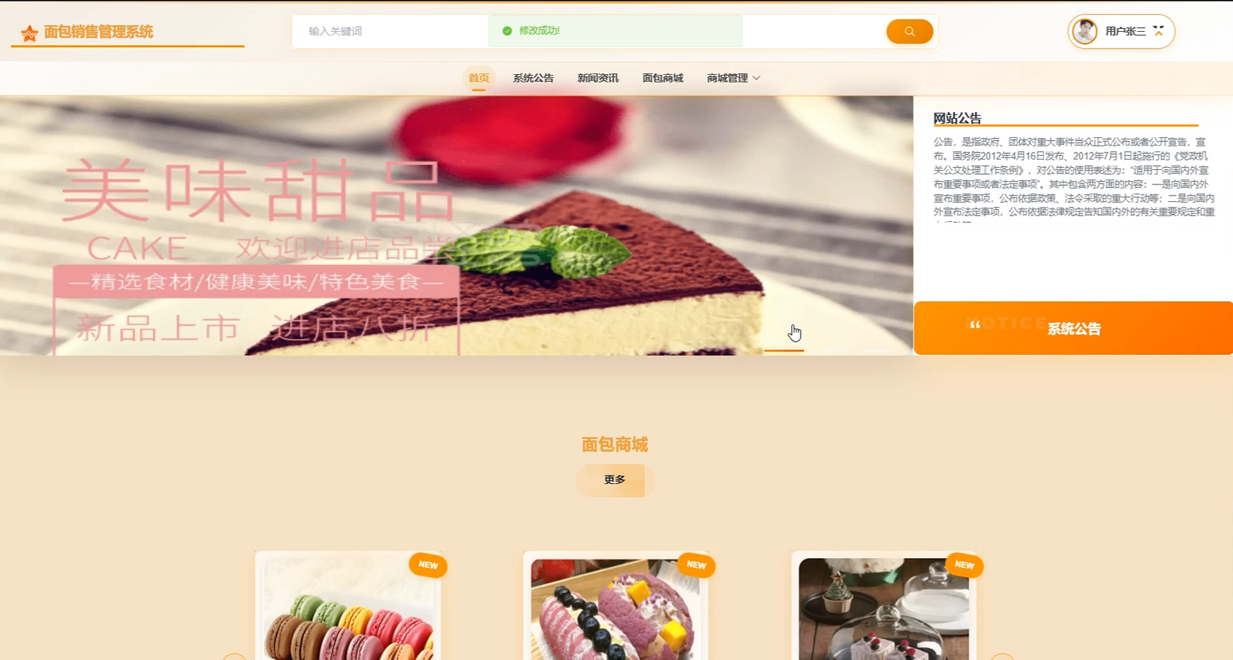 (2)首页:用户进入面包销售系统的时候,首先映入眼帘的是系统的首页、系统公告、新闻资讯、面包商城、商城管理等信息。