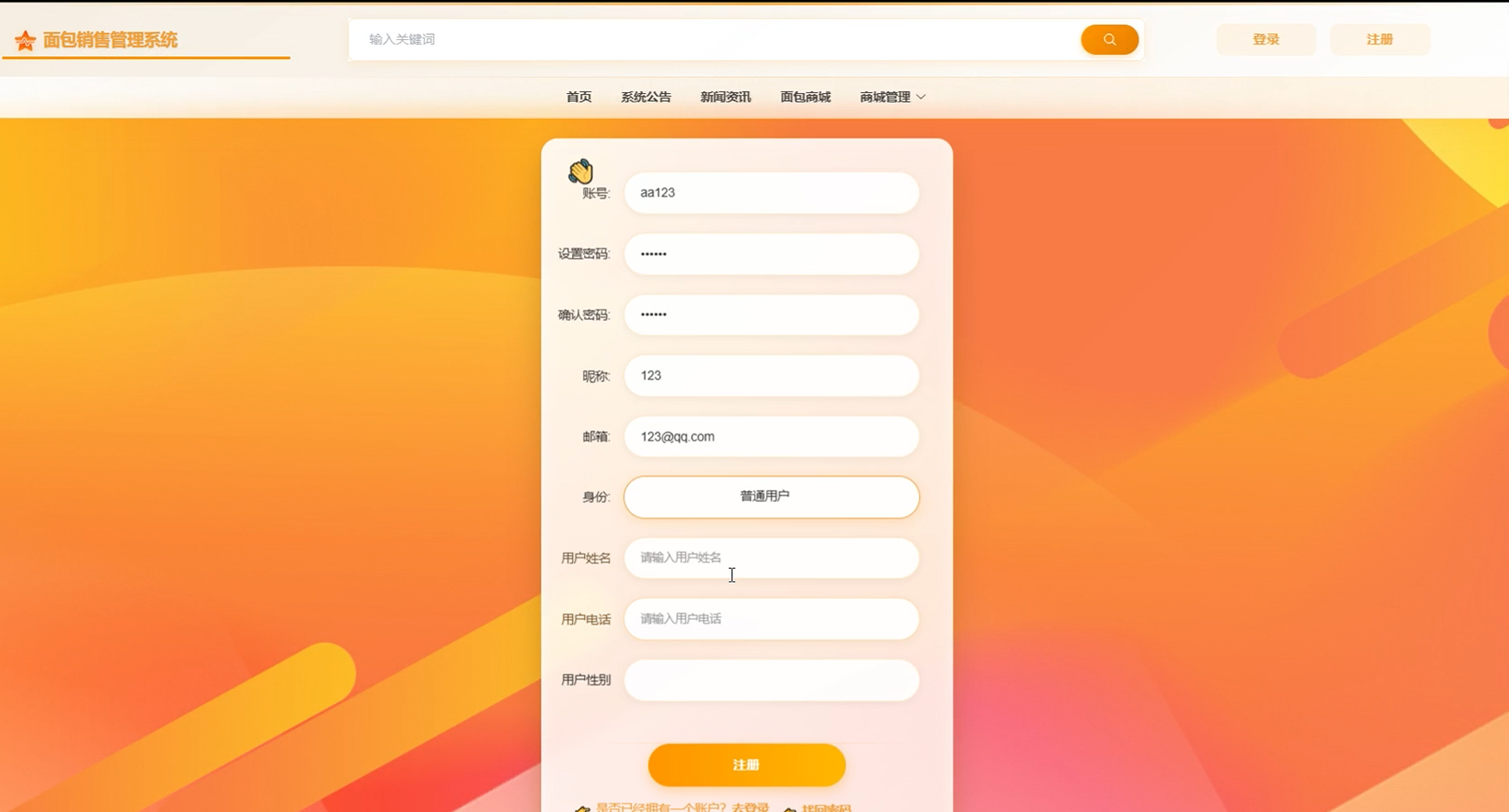 在本次主要测试用户登录、修改面、以及面包商城添加、查看、搜索流程操作。验证所有操作都能够正常运行,因此能够保证本次设计的,已实现的功能能够正常运行并且相关数据库的信息也同样保存正确。