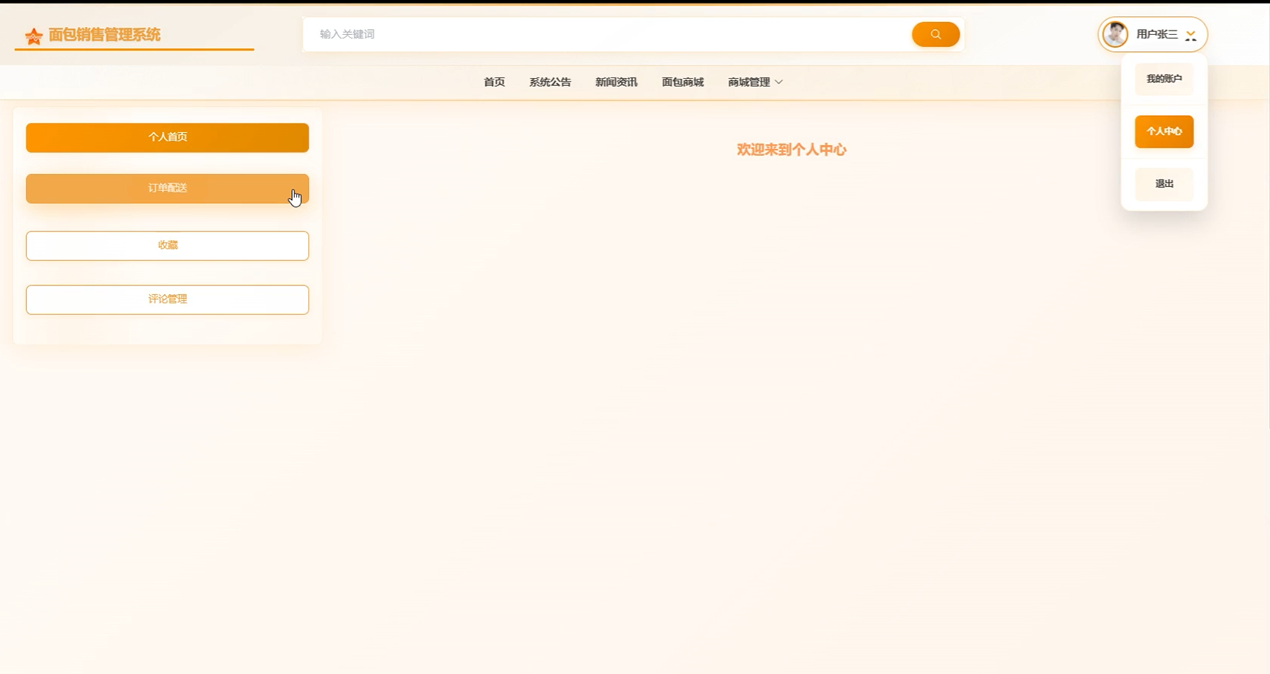 (7)个人中心:个人中心界面展示了多个功能模块,包括个人首页,订单配送,收藏,评论管理。点击进入各个功能模块可进行查看、管理和删除操作。
