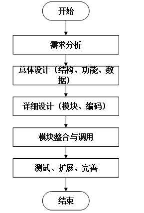 系统开发流程的主要步骤,从需求分析到系统完成的全过程。流程包括需求分析、总体设计(结构、功能、数据)、详细设计(模块、编码)、模块整合与调用,以及测试、扩展和完善,最终完成系统的开发。本系统的开发流程如图4-3所示