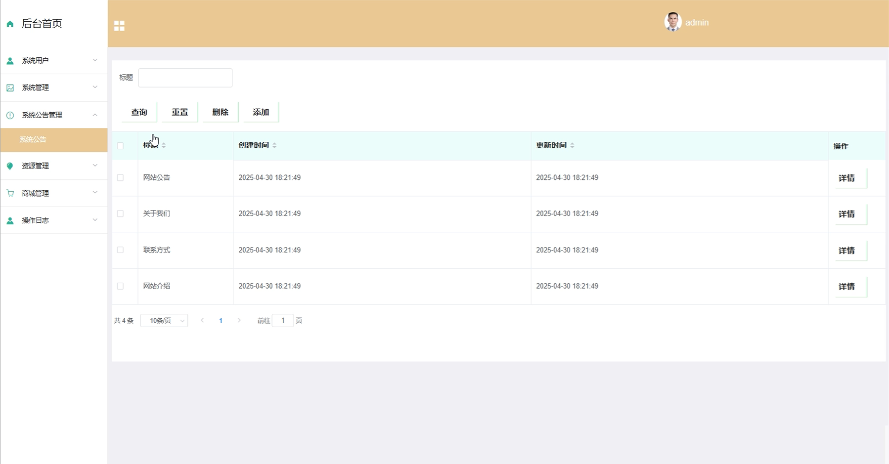 管理员的系统公告管理界面包括查询、重置、删除、添加和查看公告详情的功能。管理员可以通过查询功能搜索公告,重置则清除搜索条件,删除功能用于删除不需要的公告,添加功能则允许管理员新增公告,查看公告详情可以查看公告的完整内容。界面如下图所示。