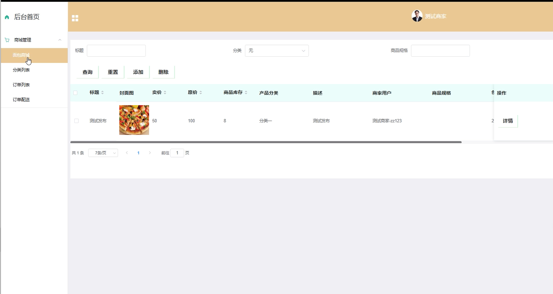 表7-3 添加面包商城测试表