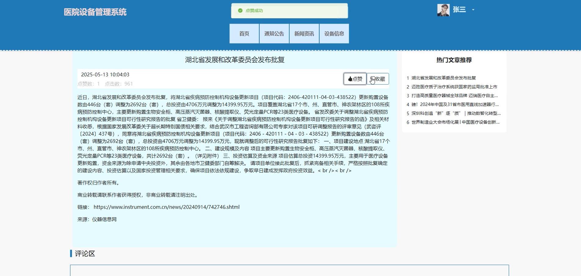 管理员可对所有设备信息进行管理和查看其信息详情,进行增改删查操作。维护用户可对自己的设备信息进行管理。支持设备名称搜索。管理员可进入详情页进行审核和回复,并可查看其评论信息和分配维护用户维护,维护用户发布添加的设备信息信息需经过管理员审核通过才可显示在系统前台上