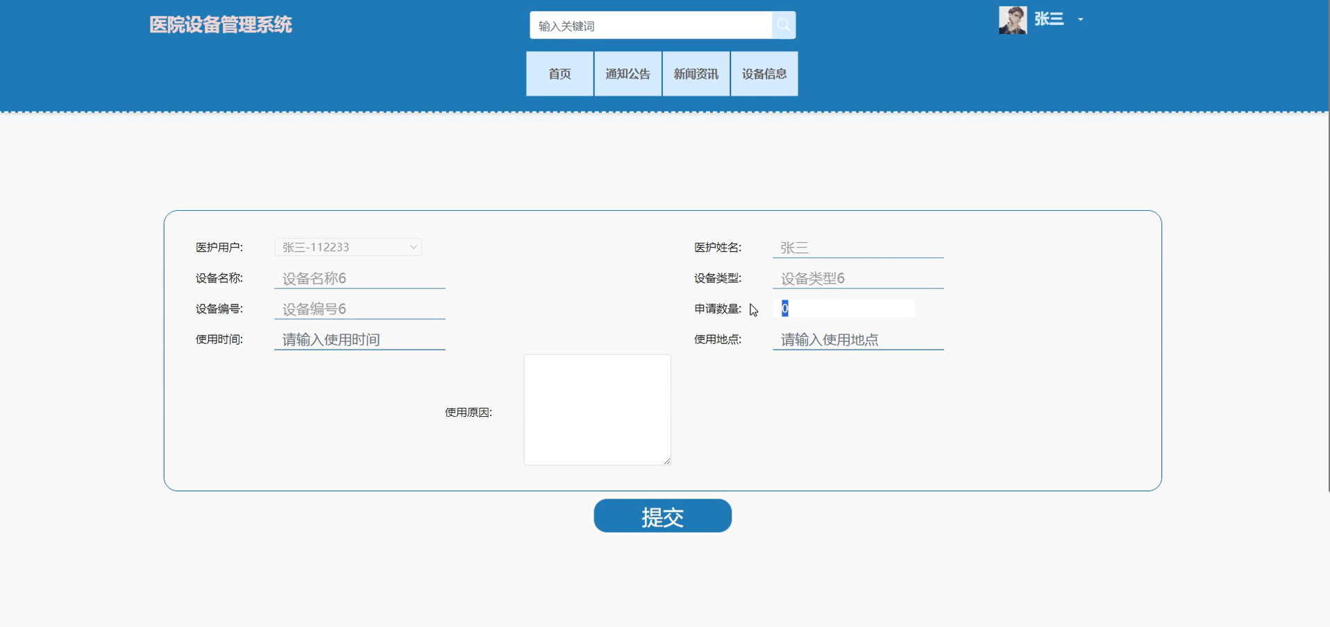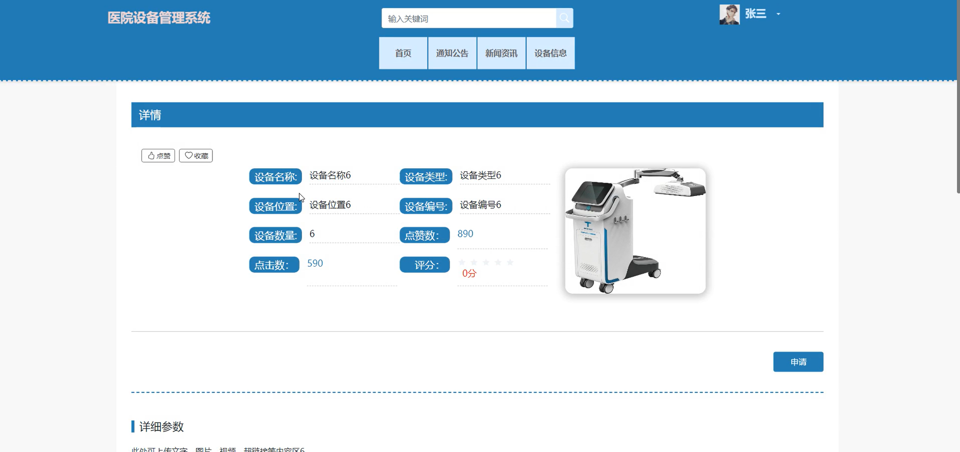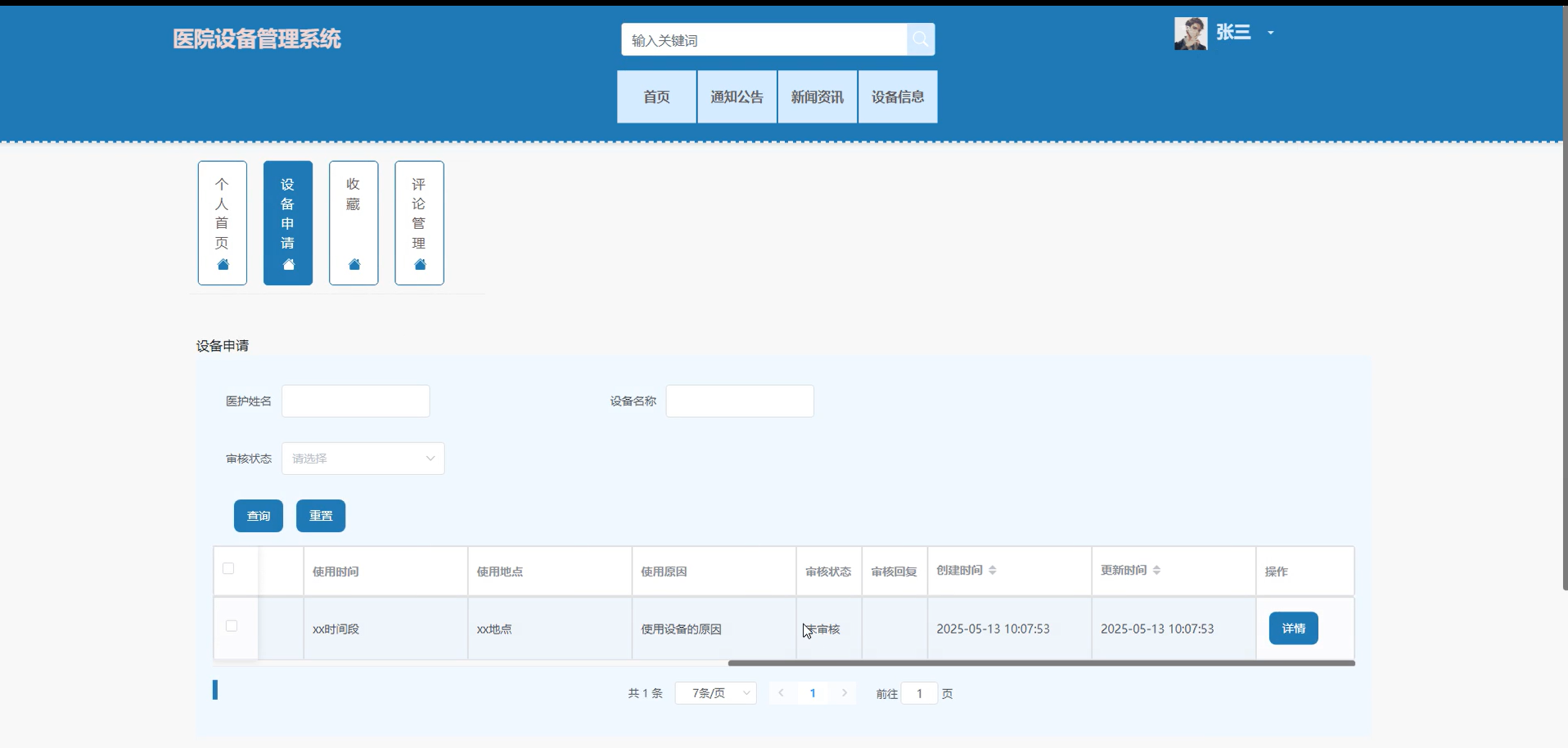 管理员可对所有设备申请进行审核和查看其信息详情,支持医护姓名搜索,可进入详情页对医护的设备申请进行审核和回复。