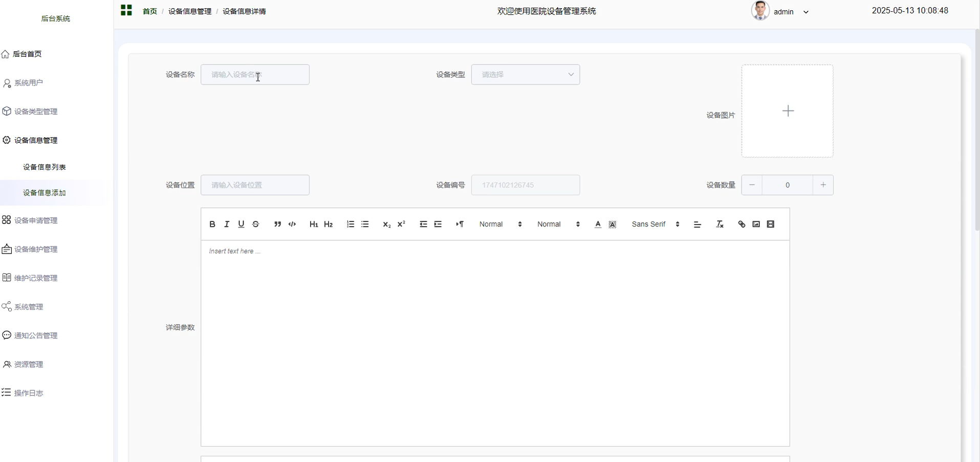 | TC004 | 验证设备信息图片上传 | 1. 进入设备信息添加界面 <br> 2. 上传设备信息相关图片 <br> 3. 点击添加按钮 | 图片成功上传并与设备信息关联 | 图片成功上传并与设备信息关联 | 通过 |