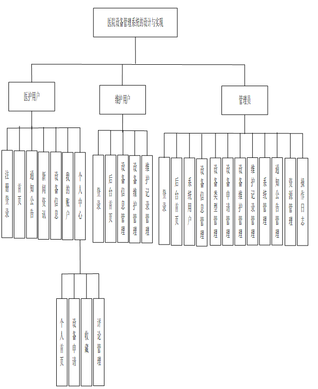 通过对应的功能做了需求分析以后该医院设备管理系统各角色主要包括的功能说明如下:
