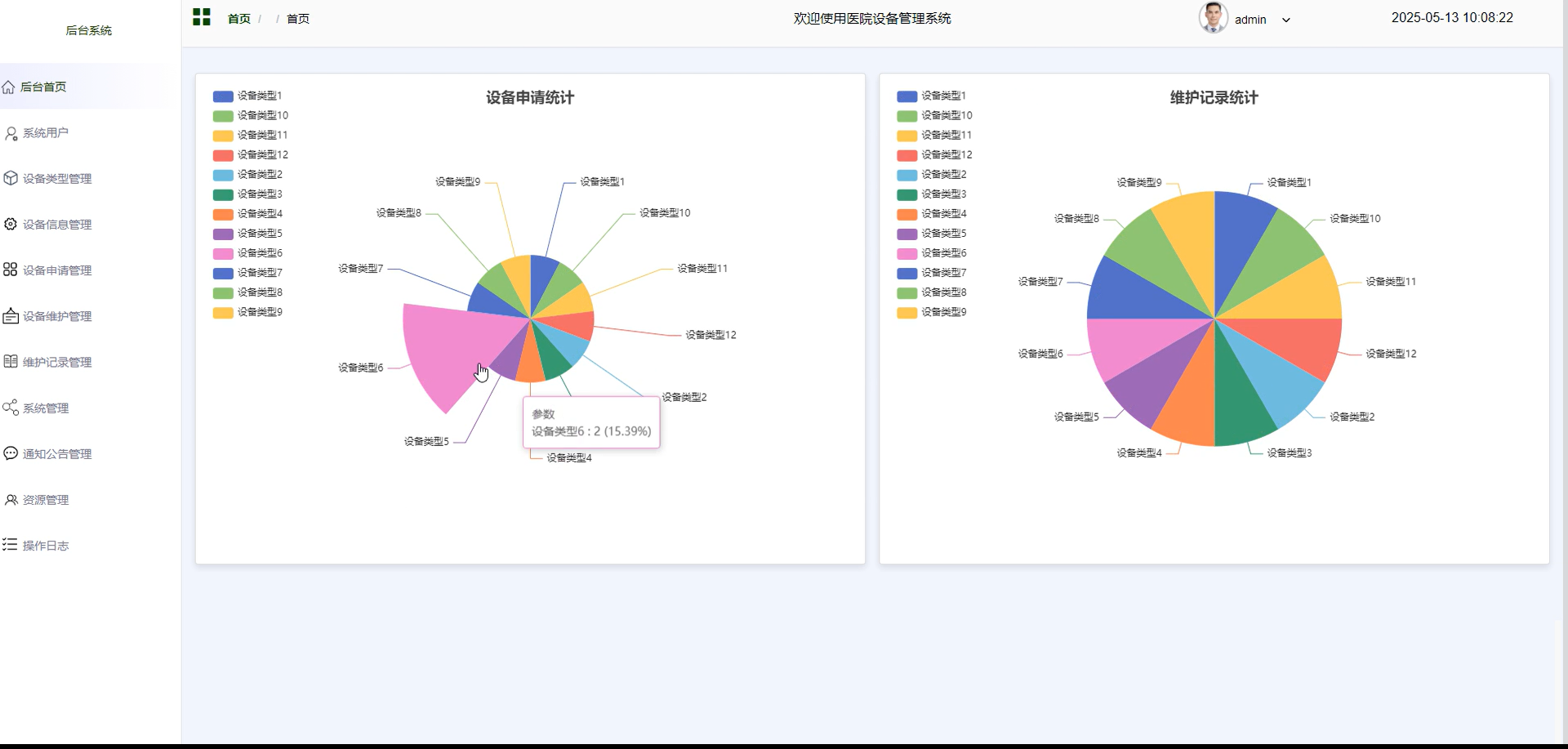 在开发医院设备管理系统时,后端采用了Java作为编程语言,并利用了SpringBoot框架,这使得复杂的业务逻辑和数据操作得以高效完成。与此同时,系统的数据存储和管理通过MySQL数据库实现。结合Vue.js作为前端框架,具有响应式数据绑定和组件化的特点,能够有效地提升用户体验和开发效率。在开发工具的选取上,使用了eclipse,它的强大功能和易用性使得编程工作更为高效;而Navicat作为数据库管理工具,使得数据库操作更为方便和快捷。这样的技术选择,确保了管理系统的开发流程既高效又稳定。本系统主要实现包括后台首页、系统用户、设备类型管理、设备信息管理、设备申请管理、设备维护管理、维护记录管理、系统管理、通知公告管理、资源管理、操作日志等功能进行管理。