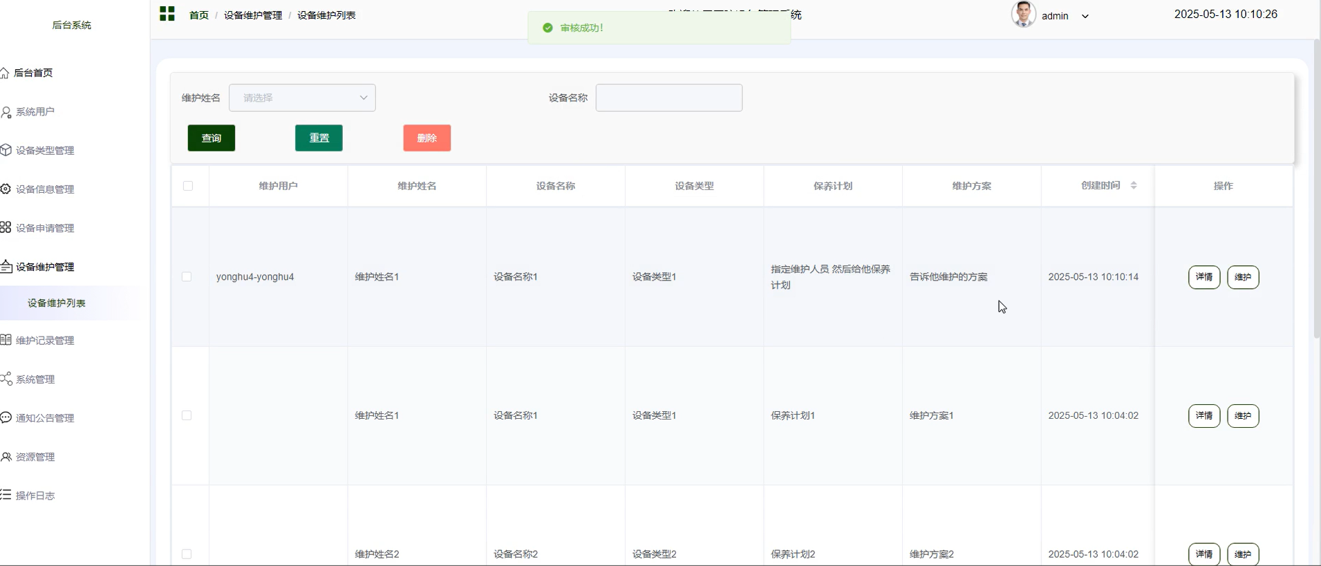 管理员可对所有设备维护进行管理和查看其信息详情,进行查询和删除操作,支持维护姓名、设备名称搜索,并可点击详情和维护操作。维护用户可对自己的设备信息进行维护,可进入详情页输入维护状态和描述等信息。