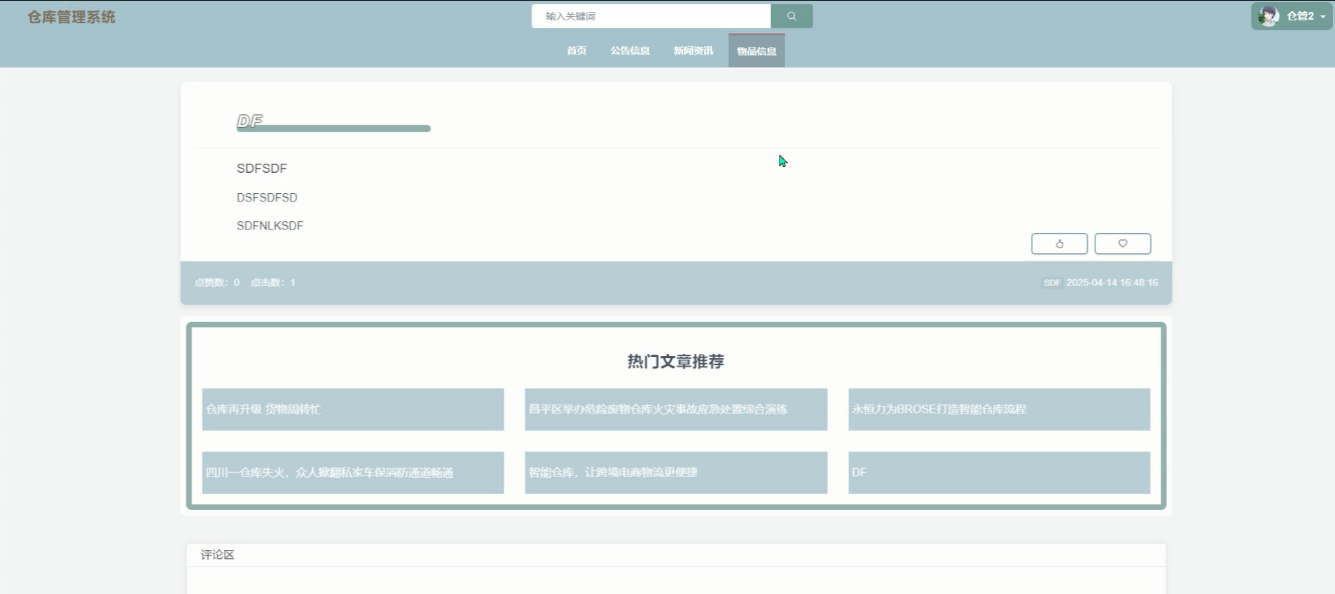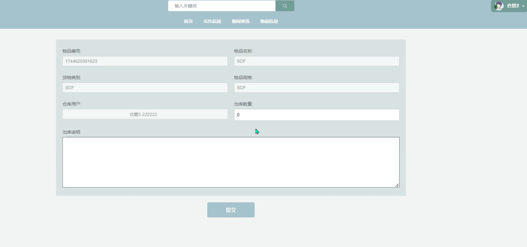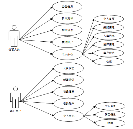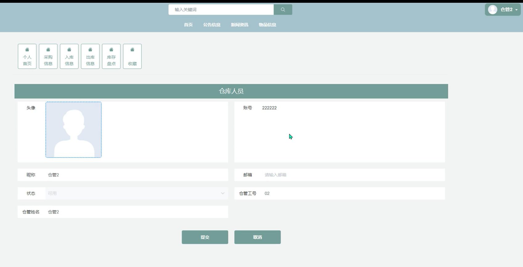 仓库人员可查看公告信息、新闻资讯、物品信息、我的账户、个人中心(个人首页、采购信息、入库信息、出库信息、库存盘点、收藏)等信息。