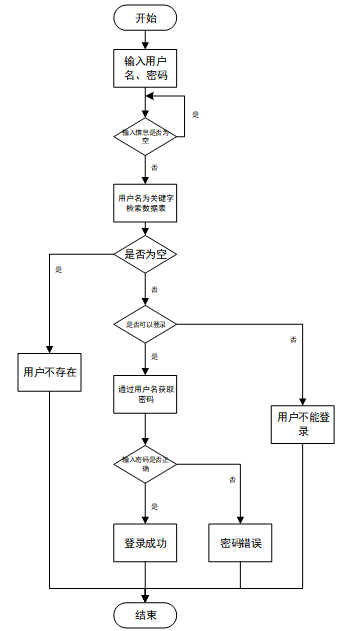 用户输入用户名和密码后,系统先检查输入是否为空,再验证用户名是否存在,若存在则通过用户名获取密码并校验。若密码正确则登录成功,否则提示密码错误。若用户名不存在或无法登录,提示用户操作无效。如图3-4所示。