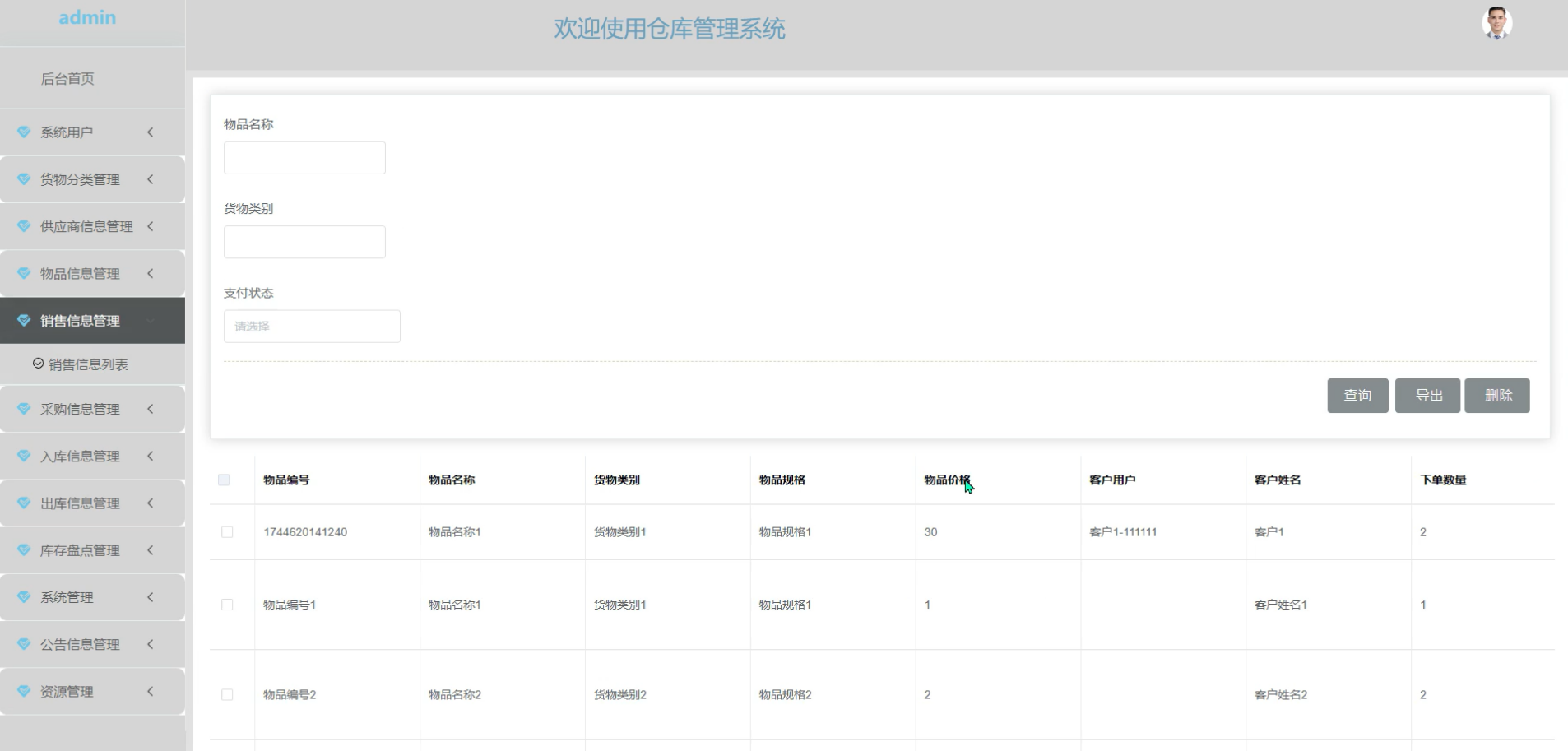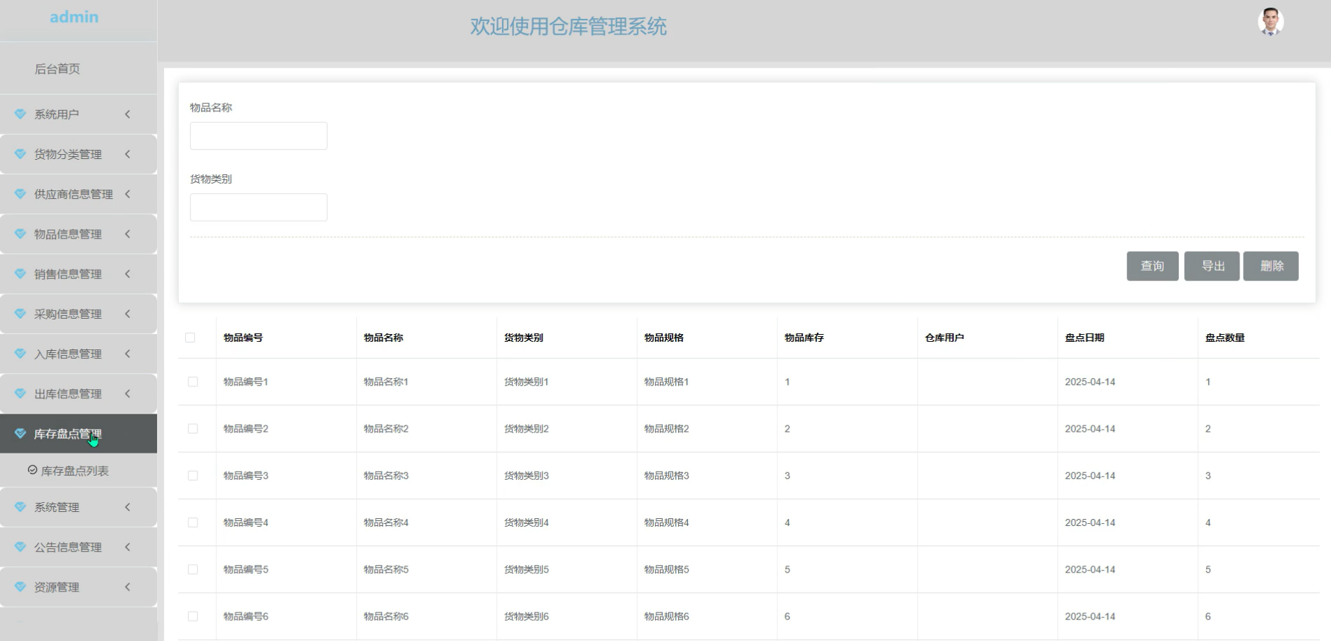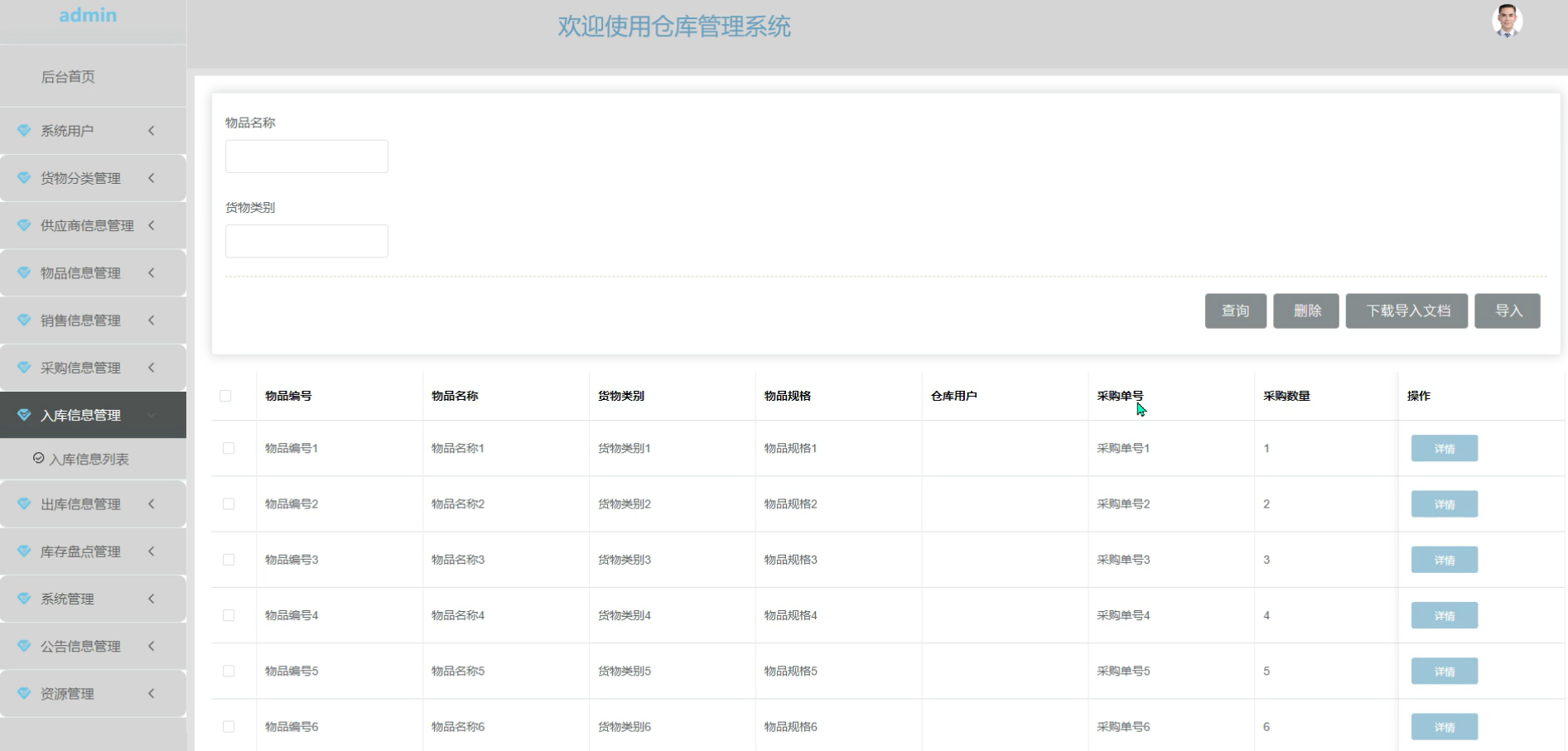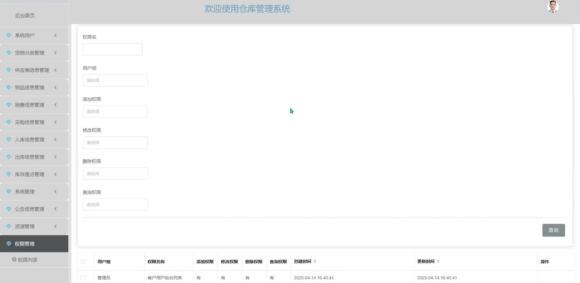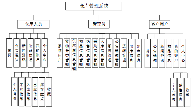 管理员可管理系统用户(管理员、客户用户、仓库人员)、货物分类管理、供应商信息管理、物品信息管理、销售信息管理、采购信息管理、入库信息管理、出库信息管理、库存盘点管理、系统管理(轮播图管理)、公告信息管理、资源管理(新闻资讯、资讯分类)、权限管理等信息。
