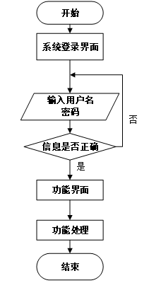 用户首先进入系统登录界面,输入用户名和密码后,系统验证信息是否正确。若验证失败,返回登录界面重新输入;若验证成功,则进入功能界面,执行相应功能处理后结束操作流程。操作流程如图3-5所示。