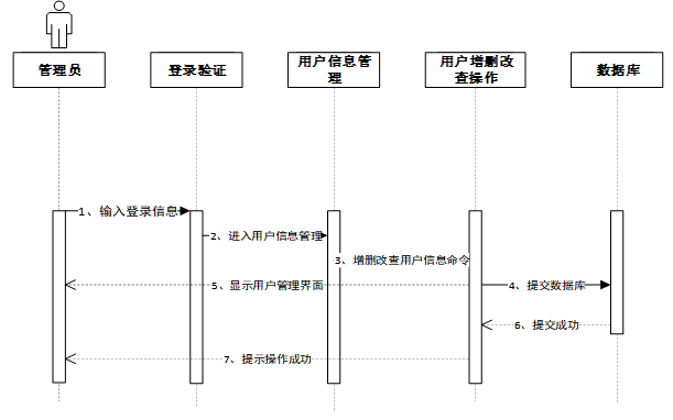 管理员输入登录信息后,进入用户信息管理模块,选择增删改查操作并提交命令至数据库。数据库执行操作后返回成功状态,系统显示用户管理界面并提示操作成功。管理员修改用户信息时序图如图4-5所示。