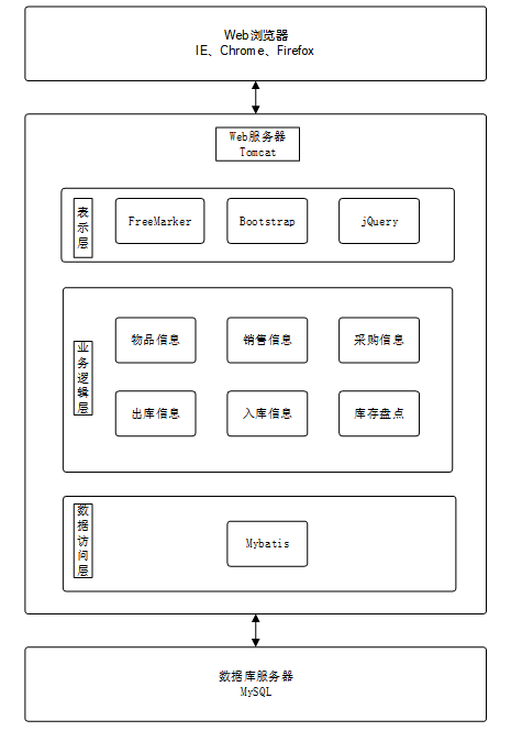 系统由表现层、业务逻辑层、数据访问层和数据库服务器组成。表现层通过浏览器(如IE、Chrome、Firefox)与用户交互,采用FreeMarker、Bootstrap、jQuery等技术实现界面呈现。业务逻辑层负责处理系统的核心业务逻辑,通过分模块设计实现功能分离。数据访问层使用MyBatis框架连接数据库,执行数据的增删改查操作。数据库服务器采用MySQL进行数据存储和管理,为系统提供稳定的数据库支持。整个架构通过Tomcat服务器完成用户请求的接收和处理,确保系统的高效运行[8]。整个系统架构如图4-1所示。
