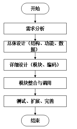 系统开发流程的主要步骤,从需求分析到系统完成的全过程。流程包括需求分析、总体设计(结构、功能、数据)、详细设计(模块、编码)、模块整合与调用,以及测试、扩展和完善,最终完成系统的开发。本系统的开发流程如图3-3所示