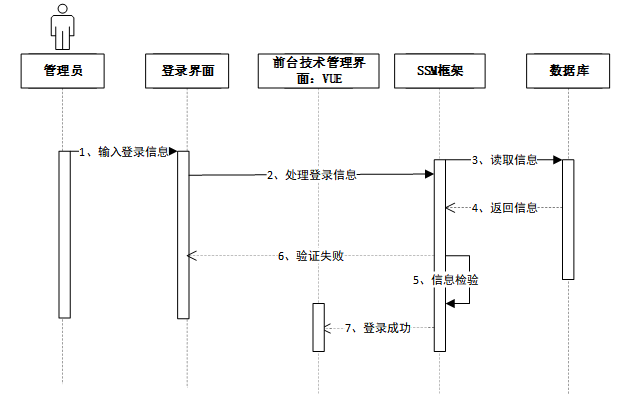 管理员输入登录信息后,登录界面将信息传递至前台管理界面,随后通过SSM框架读取数据库中的用户信息并返回。系统验证信息,若验证成功则登录成功,若验证失败则返回错误提示。登录时序图如图4-4所示。